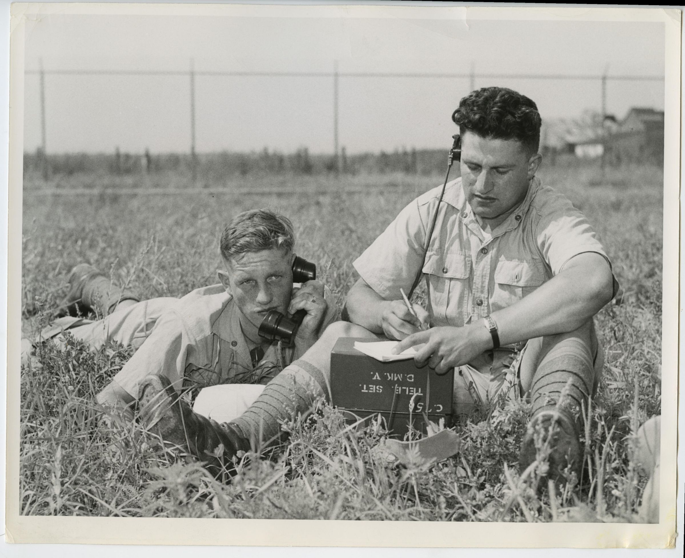 Privates A. Rigby and D. H. Adler in a field at the Three Rivers Machine Gun Training Centre during summer camp in 1941. They are practicing the use of the field telephone sending and receiving messages.Photograph Details