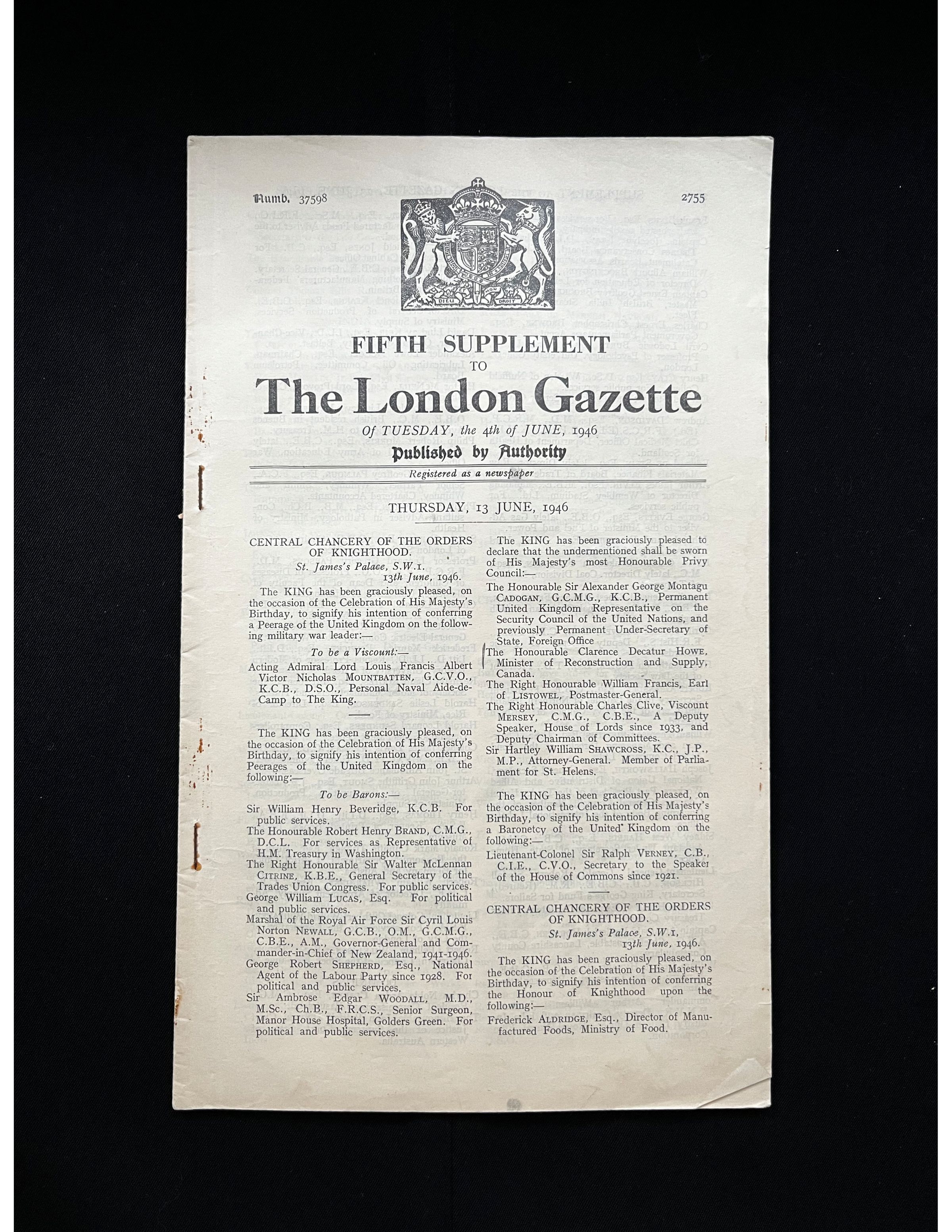 The Fifth supplement to The London Gazette's June 4th 1946 issue. This issue lists the names of all individuals who received various peerages (Viscounts, Barons, Knights, Orders.) This includes individuals in England and the rest of the Commonwealth (Canada, Australia, India).Archive Details