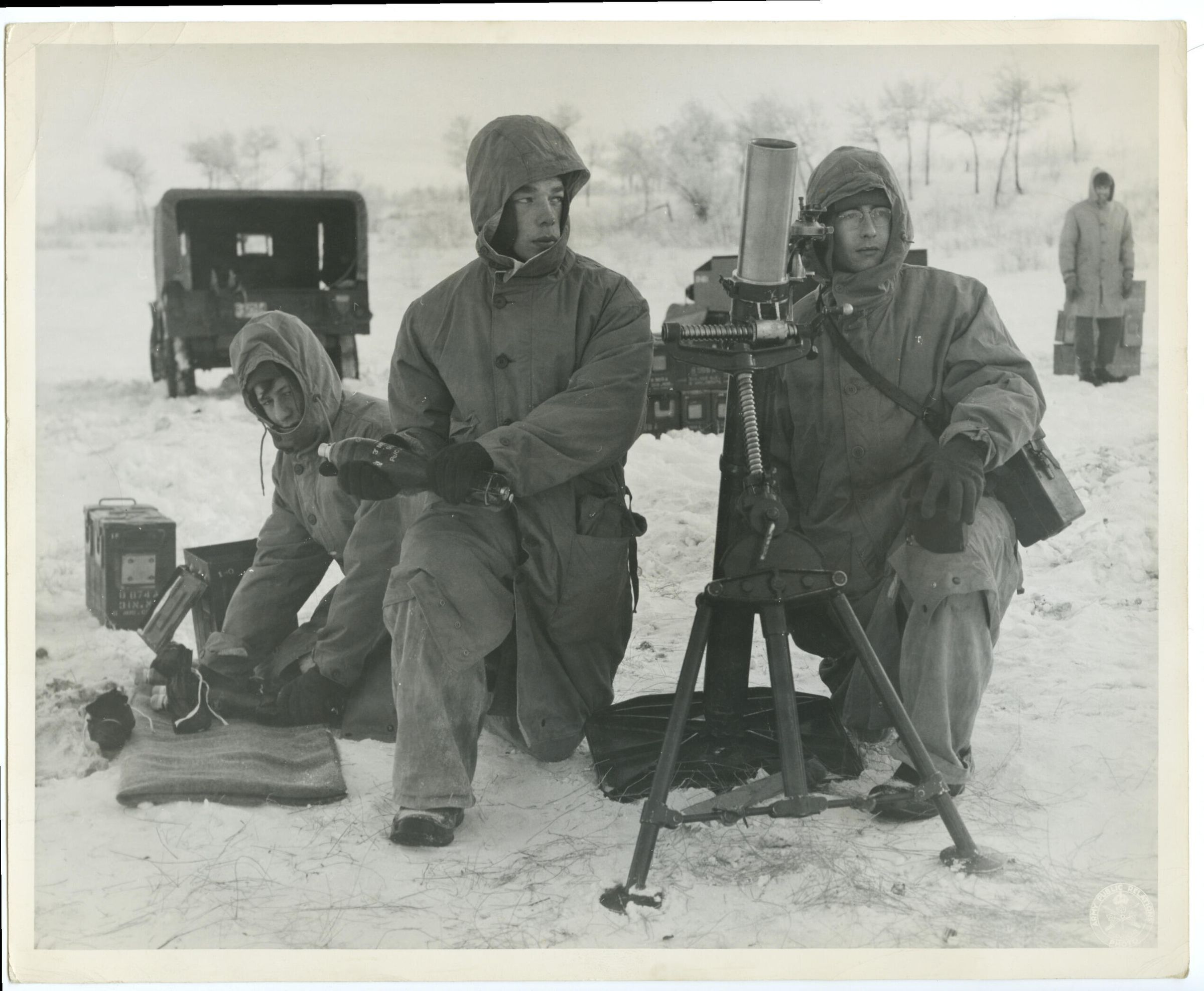 Three soldiers are practicing firing from 3 Inch mortars on Winter exercise In Camp Valcartier.Photograph Details