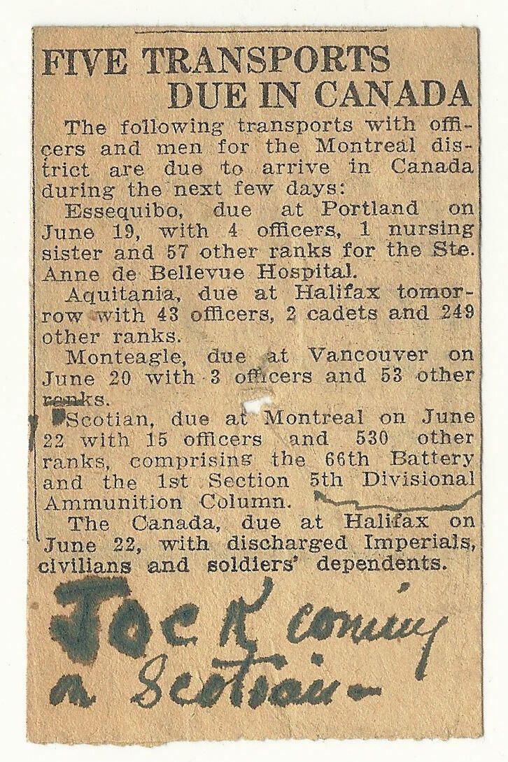 A small newspaper clipping with handwritten inscription on the b. The brief article names five ships due to arrive in several ports during June 1919 with officers and men of various Canadian Army units returning from WWI.Lexicon