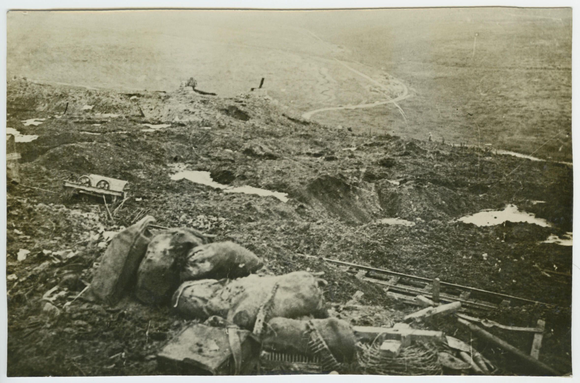 A view of the battlefield from Fort Douaumont. In the foreground a pile of sand bags and amunition are scattered. Beyond that are the tracks of a light rail tramway. Lower ground in the distance shows desolated scenery.Photograph Details