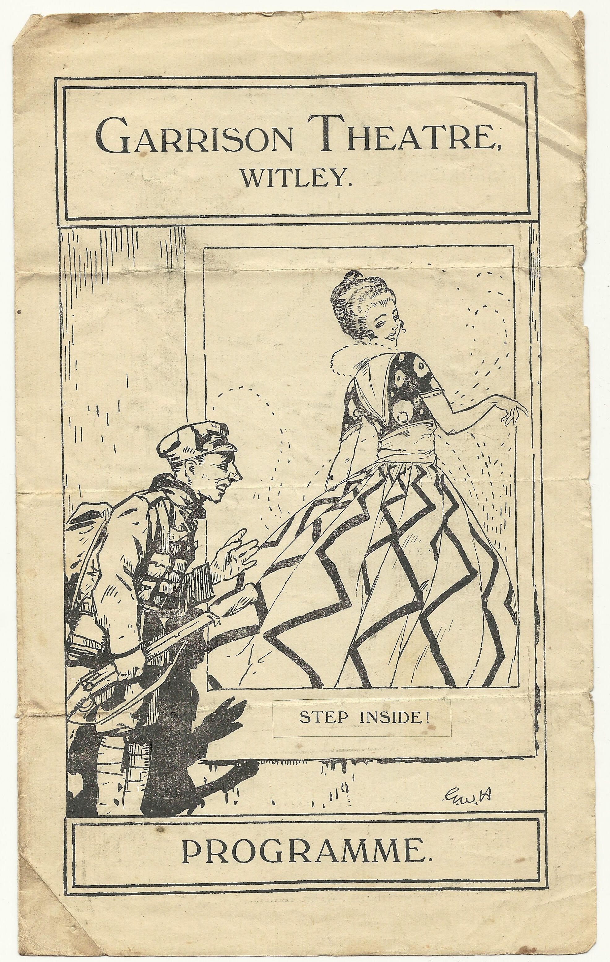A theatre programme. The cover illustration shows a lady wearing a long dress looking over her shoulder towards a soldier in uniform holding a rifle.Lexicon