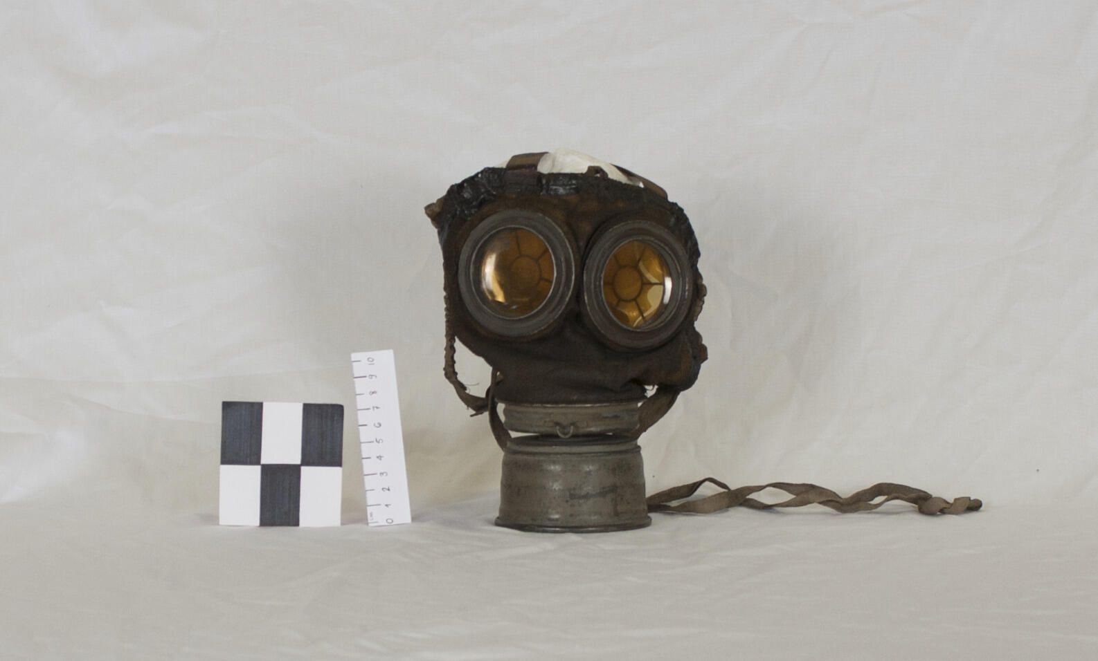 Metal and leather German gas mask with a metal respirator attached. The eye openings are in plastic. A cylindrical metal case is included.