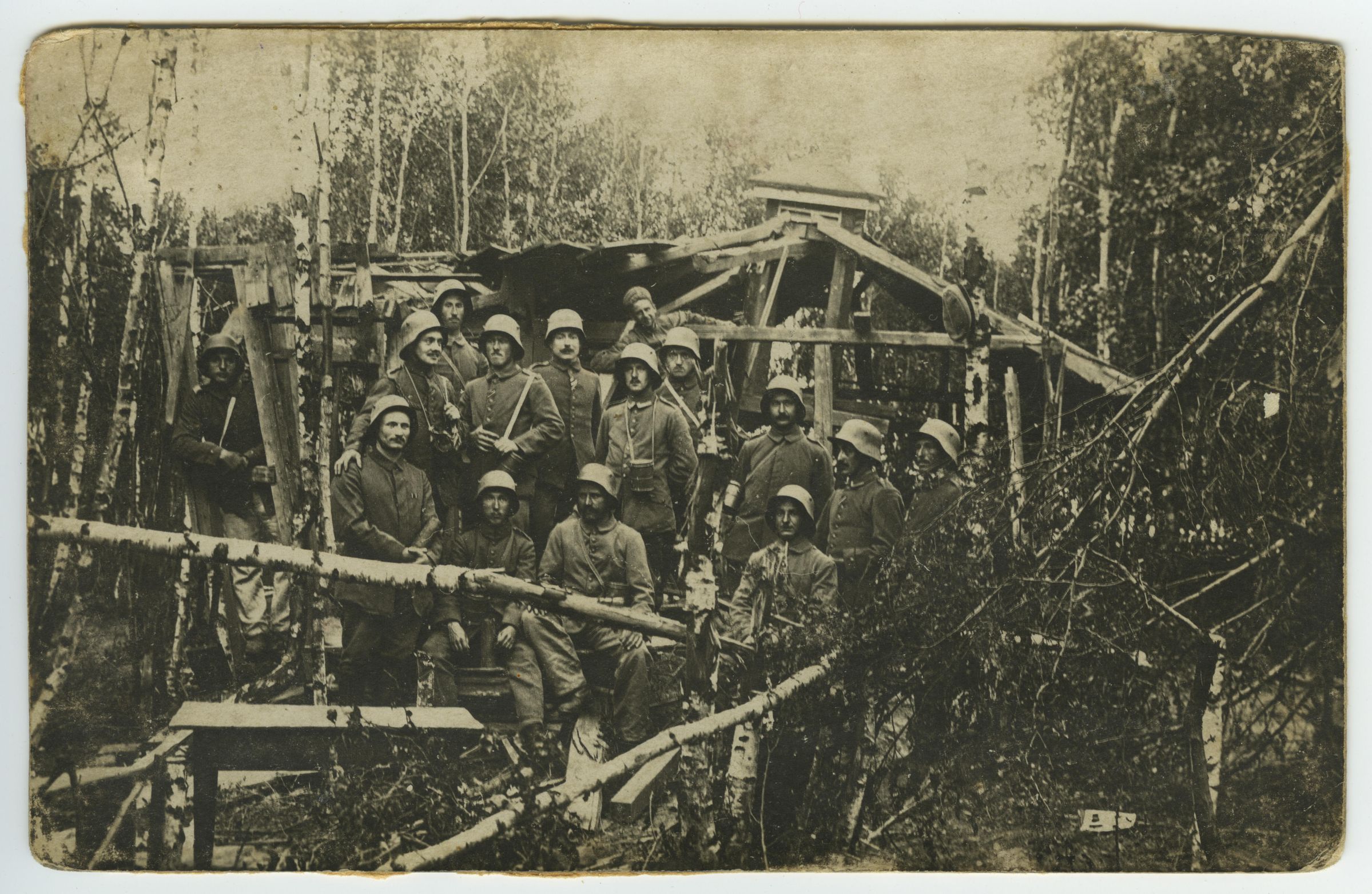 14 helmeted German soldiers are posing in an informal group. Behind them, a rough wooden shelter.Made/Created