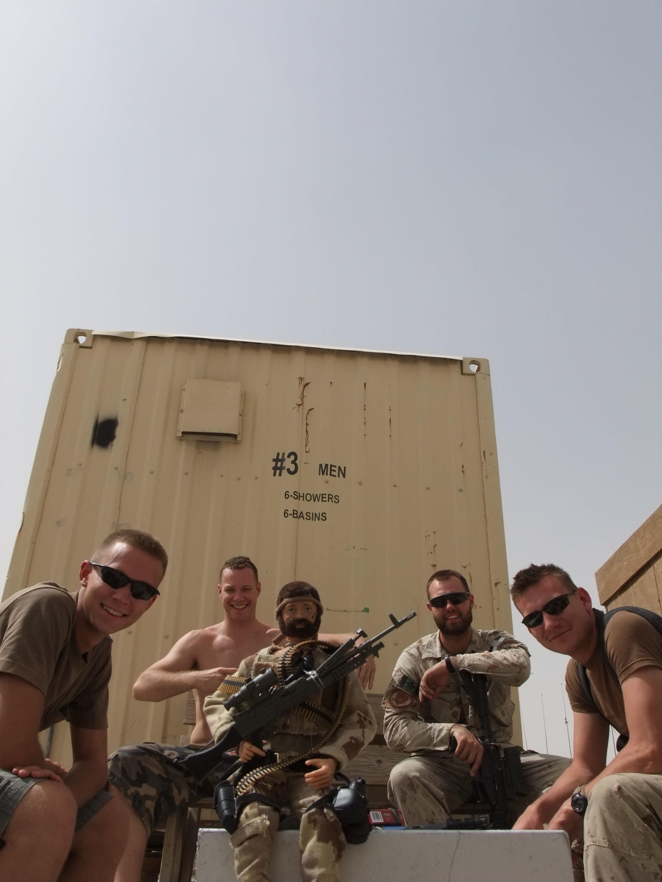 They are posing with one of the RMR favourite members "GI Joe". The action figure was adopted as the unofficial mascot of the RMR Junior Ranks Club. The group is seated outside a sea container that was converted into wash facilities.Photograph Details