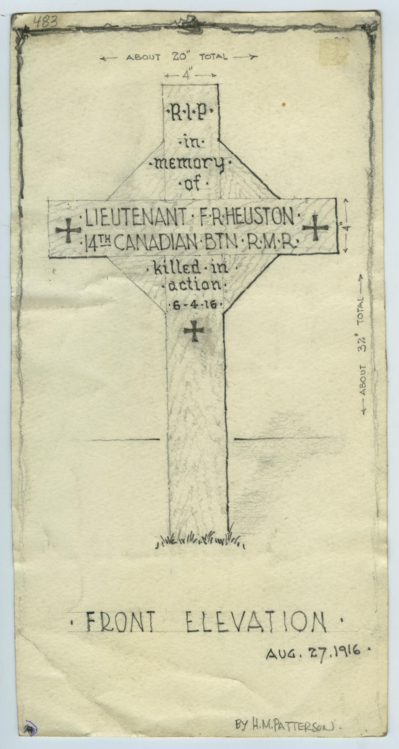 A drawing for a grave marker for Lieutenant Francis Robert Heuston. The drawing was done by H.M Patterson (name signed at the bottom of the paper). It depicts the dimensions for a gravemarker of Lieutenant Heuston who served with the 14th Battalion, Royal Montreal Regiment. Despite the inscription and date in the drawing, Lieut Heuston's records show he died of his wounds on April 7, 1916.Lexicon