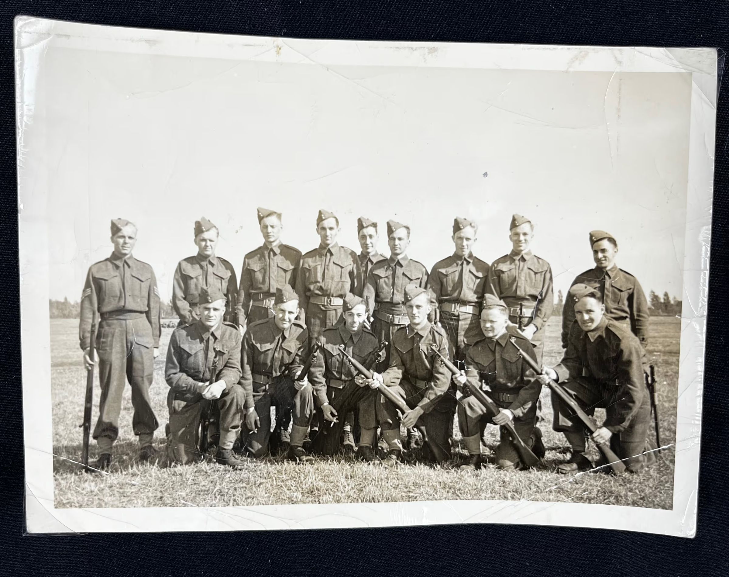 Posed group photo of 15 men in uniform, holding Lee-Enfield rifles. The photo was taken in July 1942 at Huntingdon, Quebec, according to the note on the back written in pencil. The men are standing and kneeling in a field, trees are visible in the far background.