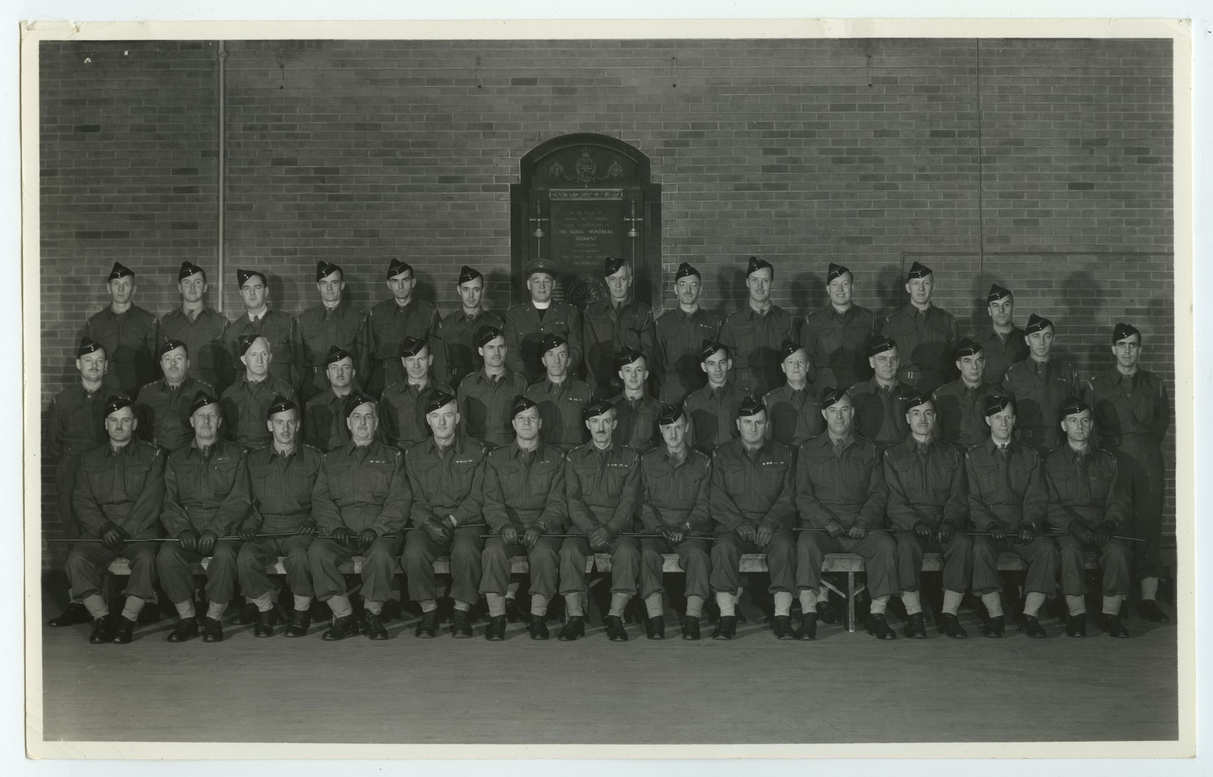 Three rows of officers of the 2nd Bn. RMR in uniform taken in front of the memorial plaque.