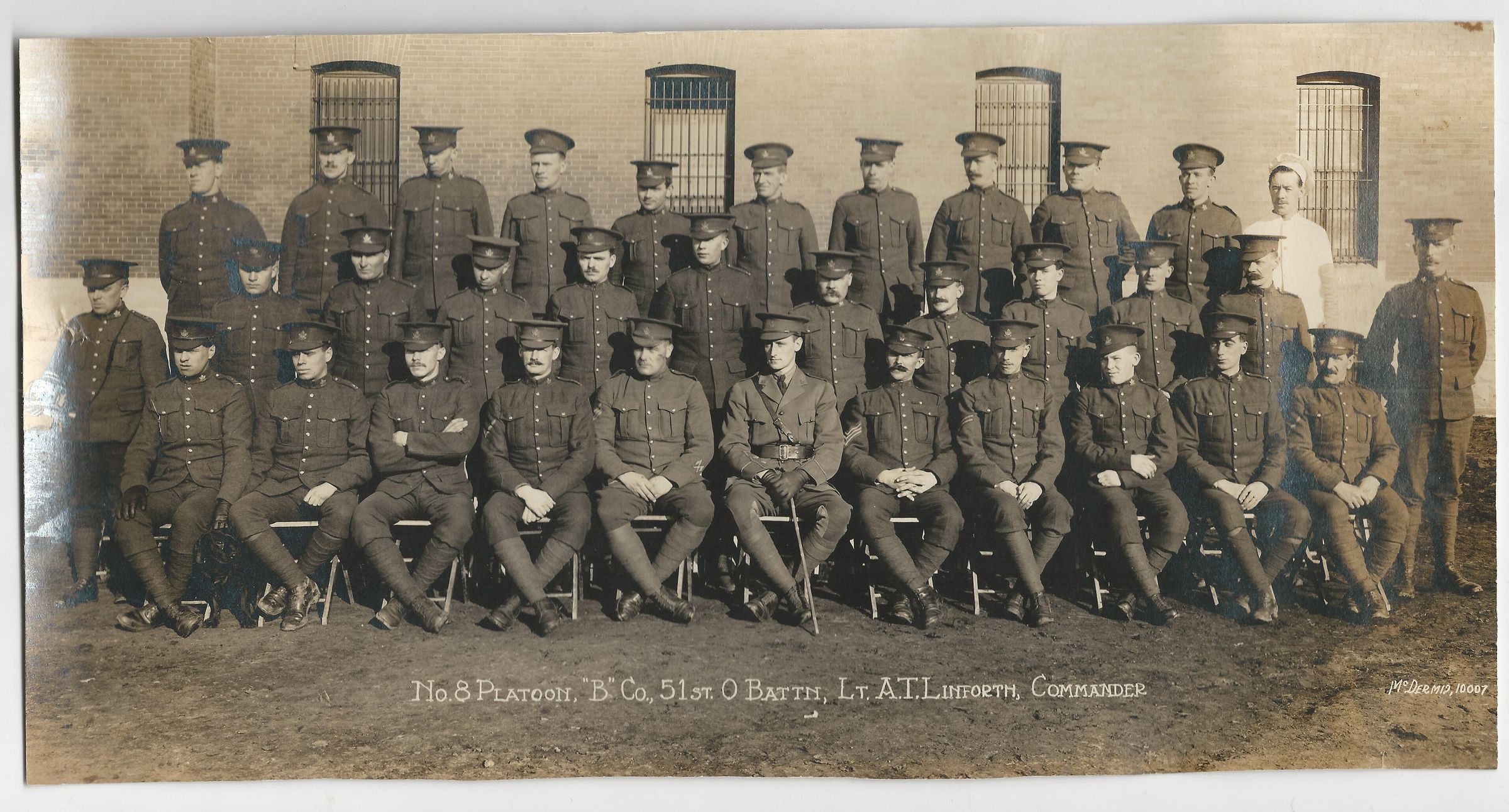 A group photograph of 34 men of the 8th Platoon of the 51st Battalion C.E.F in uniform. Charles Albert Lashbrook is amount these men. He was part of the 51st Battalion before being transferred to the 14th Battalion (RMR).Photograph Details
