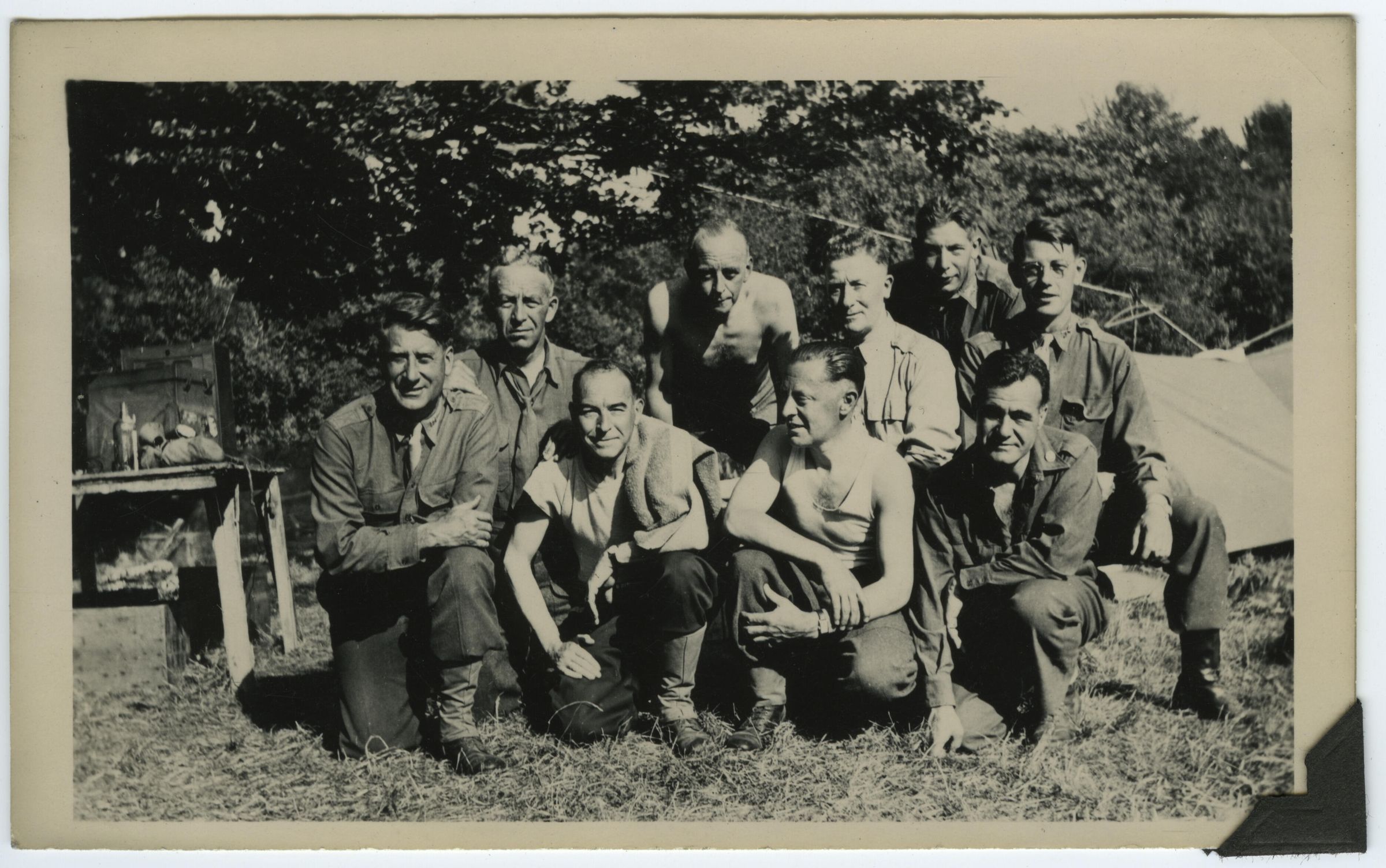 Military Members of the Allied Military Government in Occupied Europe pose shortly after their arrival in France in July 1944. Judging by their uniforms, they are possibly a mix of American, British and Commonwealth soldiers. They were assigned the task of cooperating with the local authorities as the Allied forces liberated French territory.Photograph Details
