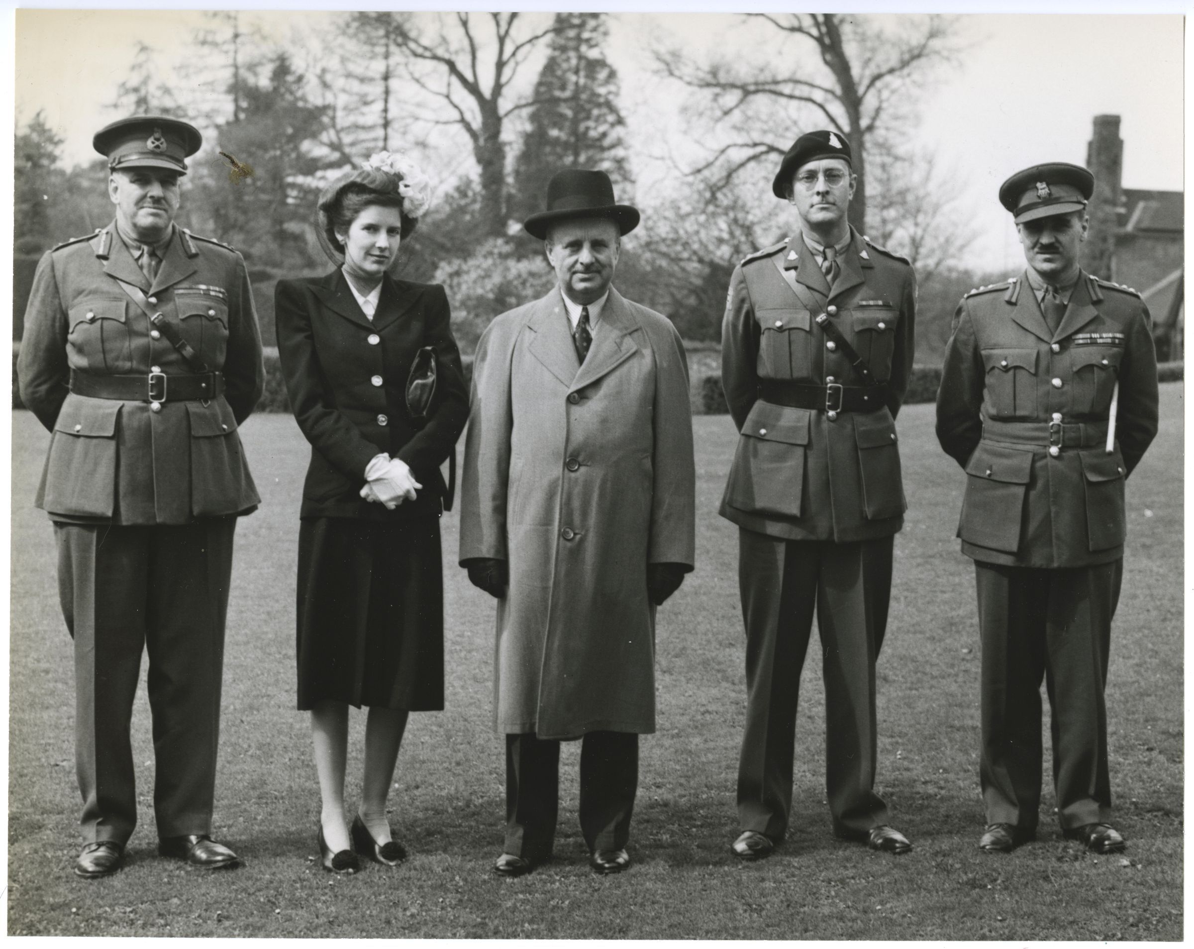 Group portrait probably taken at the Canadian Army Headquarters at Headley Court in Epsom, England. Four Officers and a lady are standing in the picture, left to right: Major General C. Basil Price, his daughter Miss Helen Price, Lt-Col Currie, Lt-Col. Thomas C. Lewis and Major General A.Ernest Walford.Photograph Details