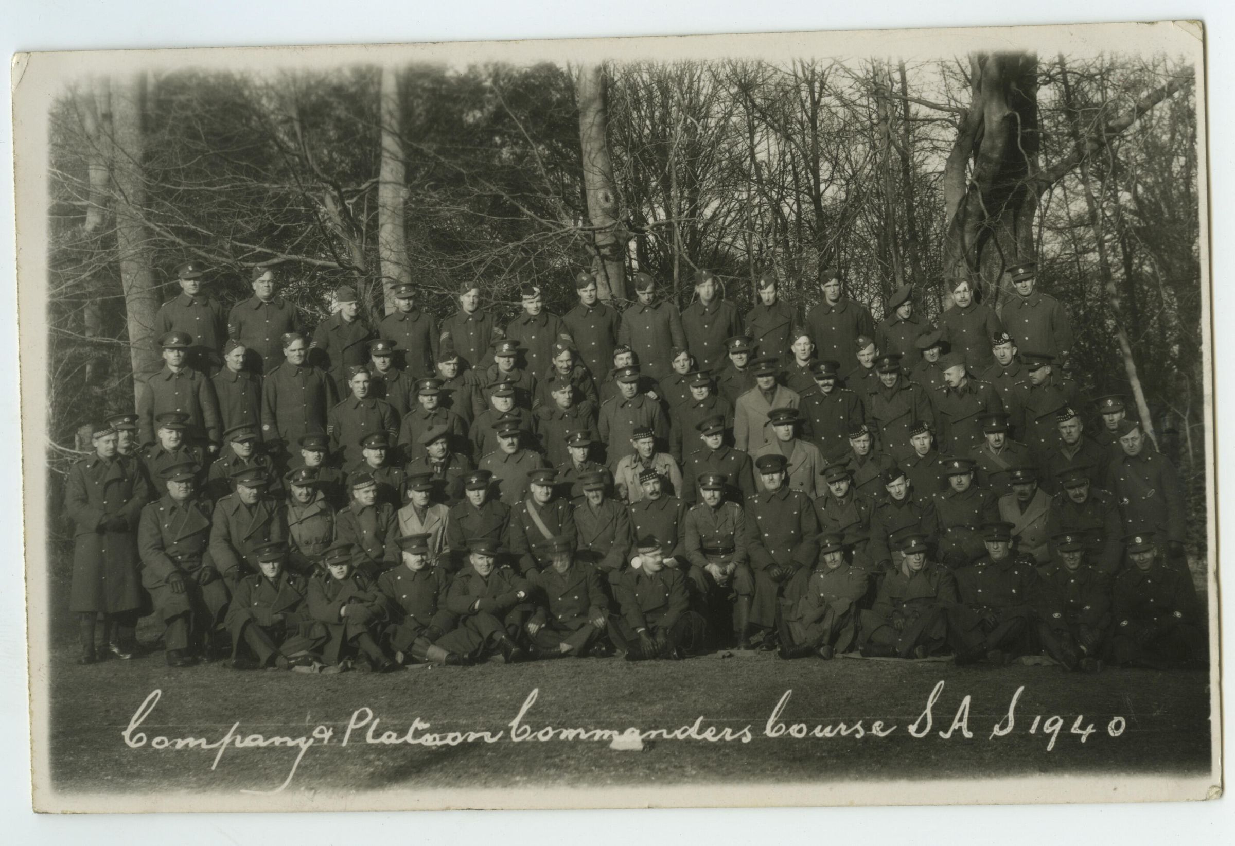 A black and white photo of a group of officers attending a Company & Platoon Commanders' course in Salisbury, England, in the winter of 1940.