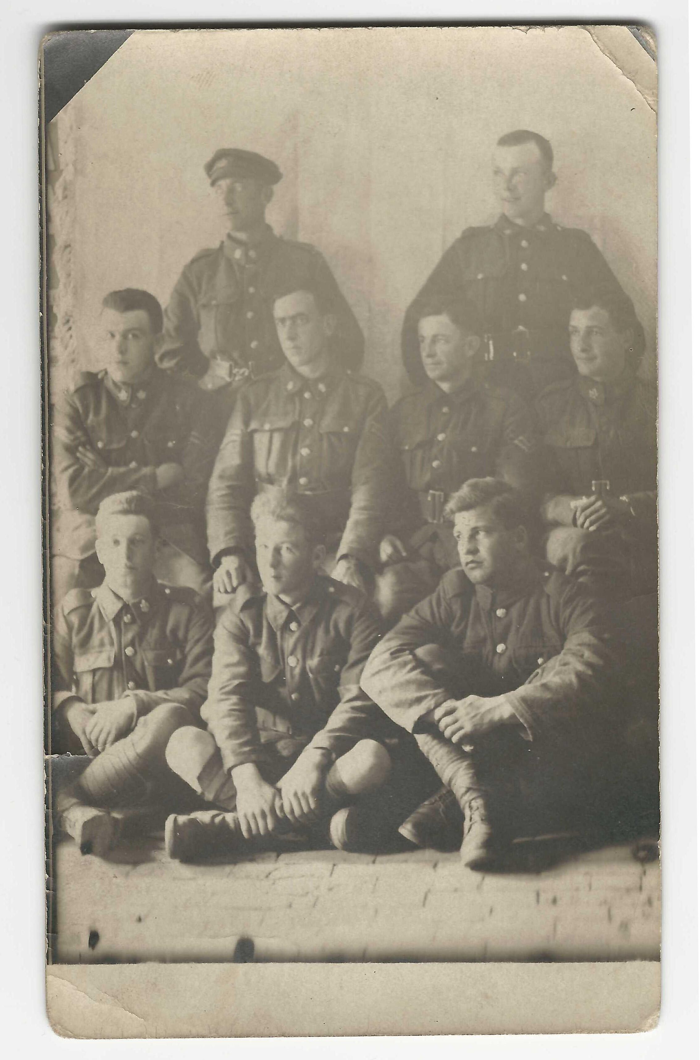 Nine soldiers in uniform are posing. Three are sitting on the ground in front, four are seated and two are standing behind.Made/Created