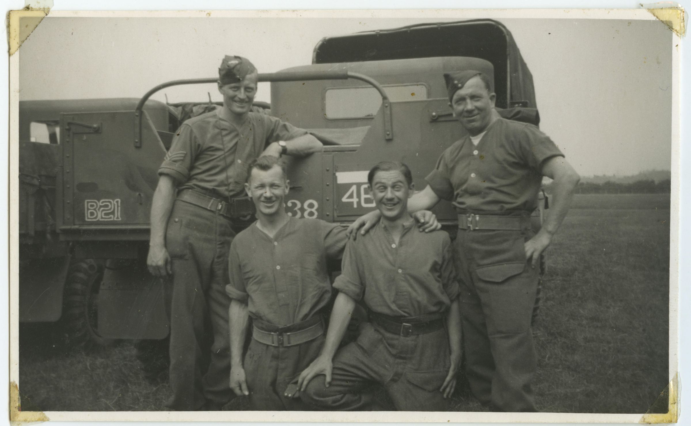 A black and white photo of four members of the Royal Montreal Regiment standing and kneeling at the rear of a CMP transport truck. As a work party, they have stripped off their tunics.