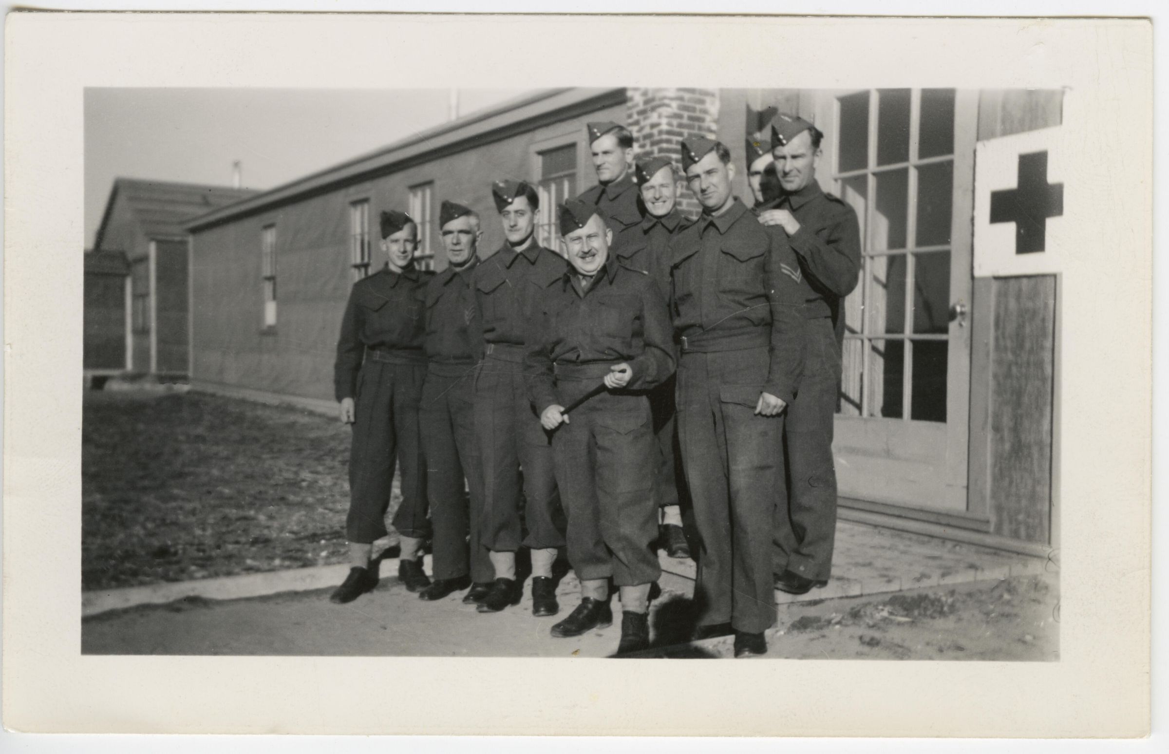A black and white photo of the Commander, Major G. Gill, and his staff at the No 14 General Hospital Detail (Detachment). The hospital was Training Centre for Canadian Army Regular in Sorel, Quebec.Photograph Details