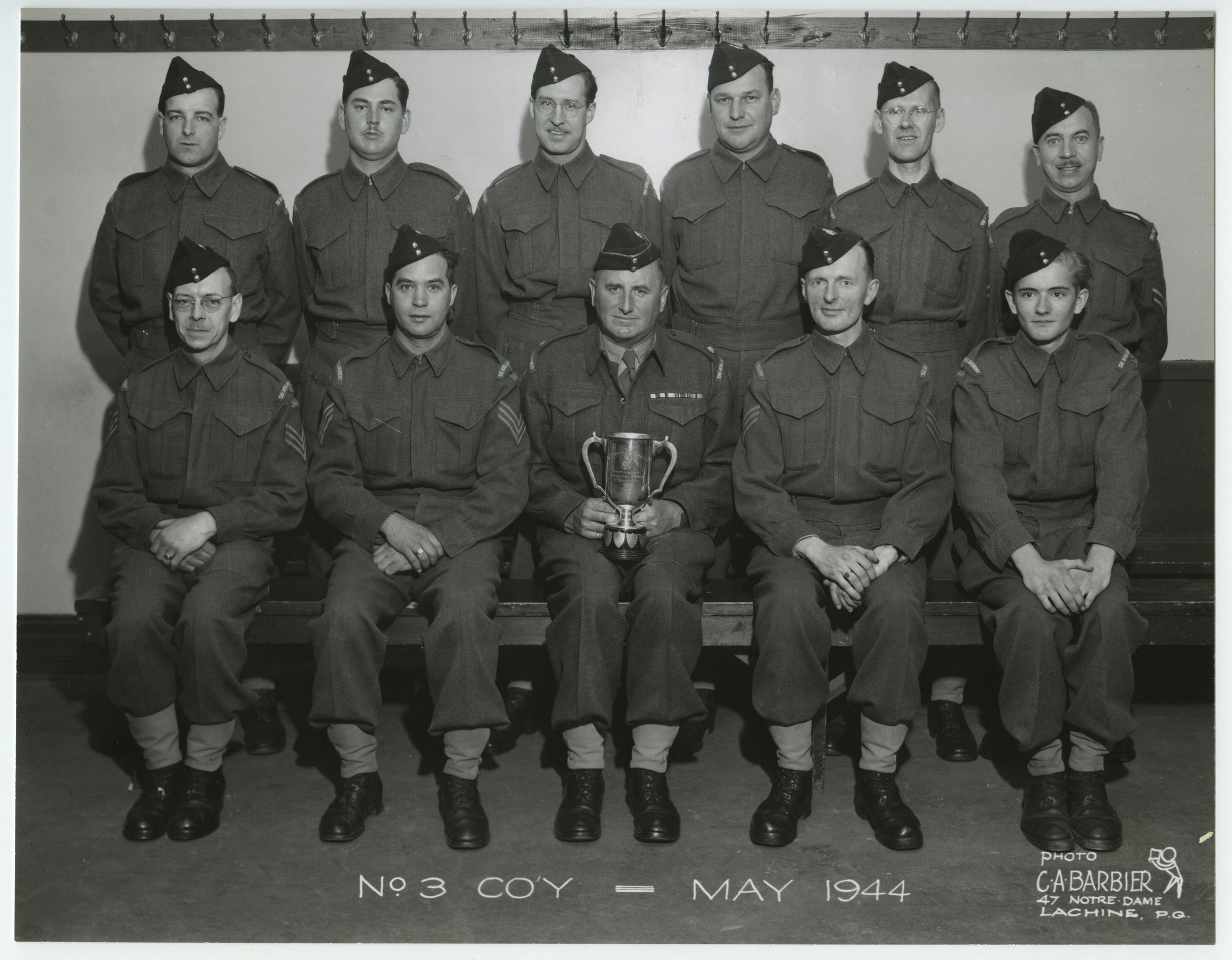 Group portrait of the eleven men No 3 Coy RMR Rifle team upon winning an inter coy competition. The Major sitting in the centre is holding a trophy.