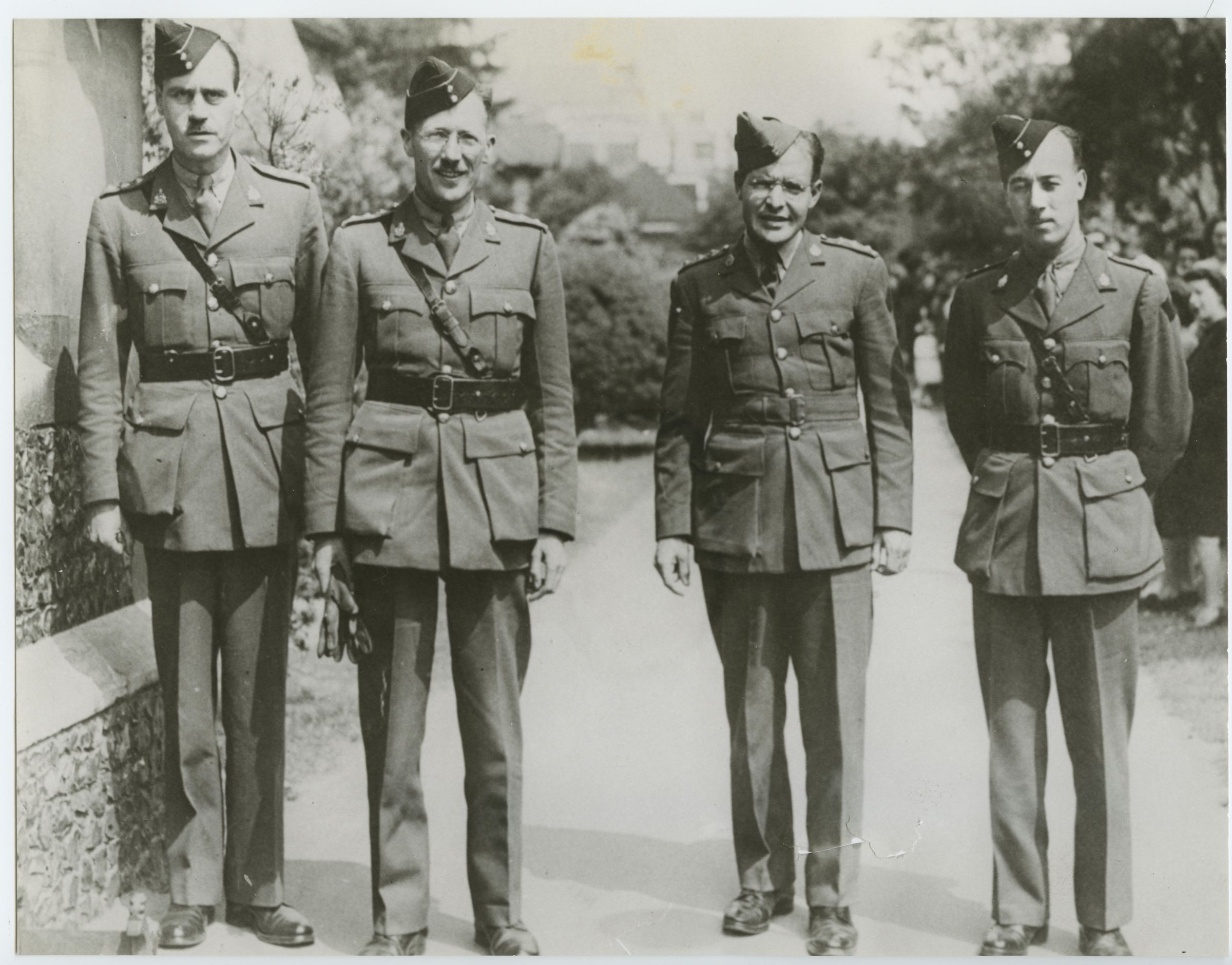 A black and white photo of four officers from the 1st Battalion, The Royal Montreal Regiment. They are wearing service dress uniforms. Three are wearing Sam Browne belts.