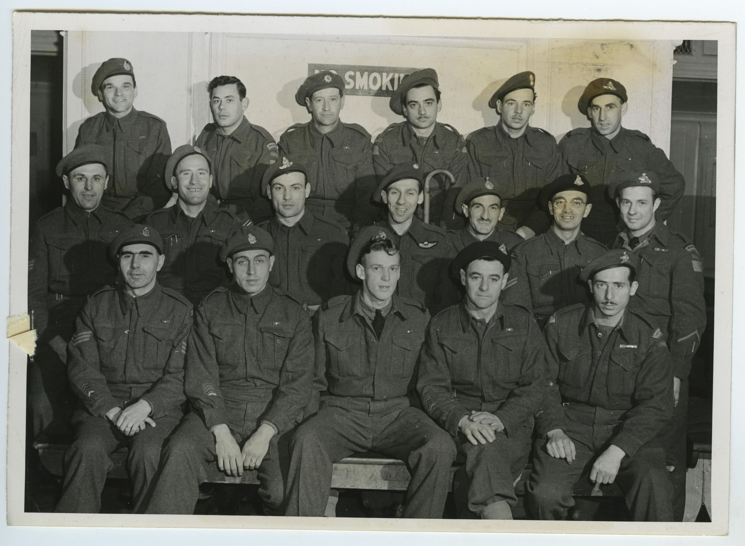 18 men in battledress uniforms of various regiments, all from Montreal. The picture was taken upon their return to Canada. All have seen service on the battlefronts of Europe.Photograph Details