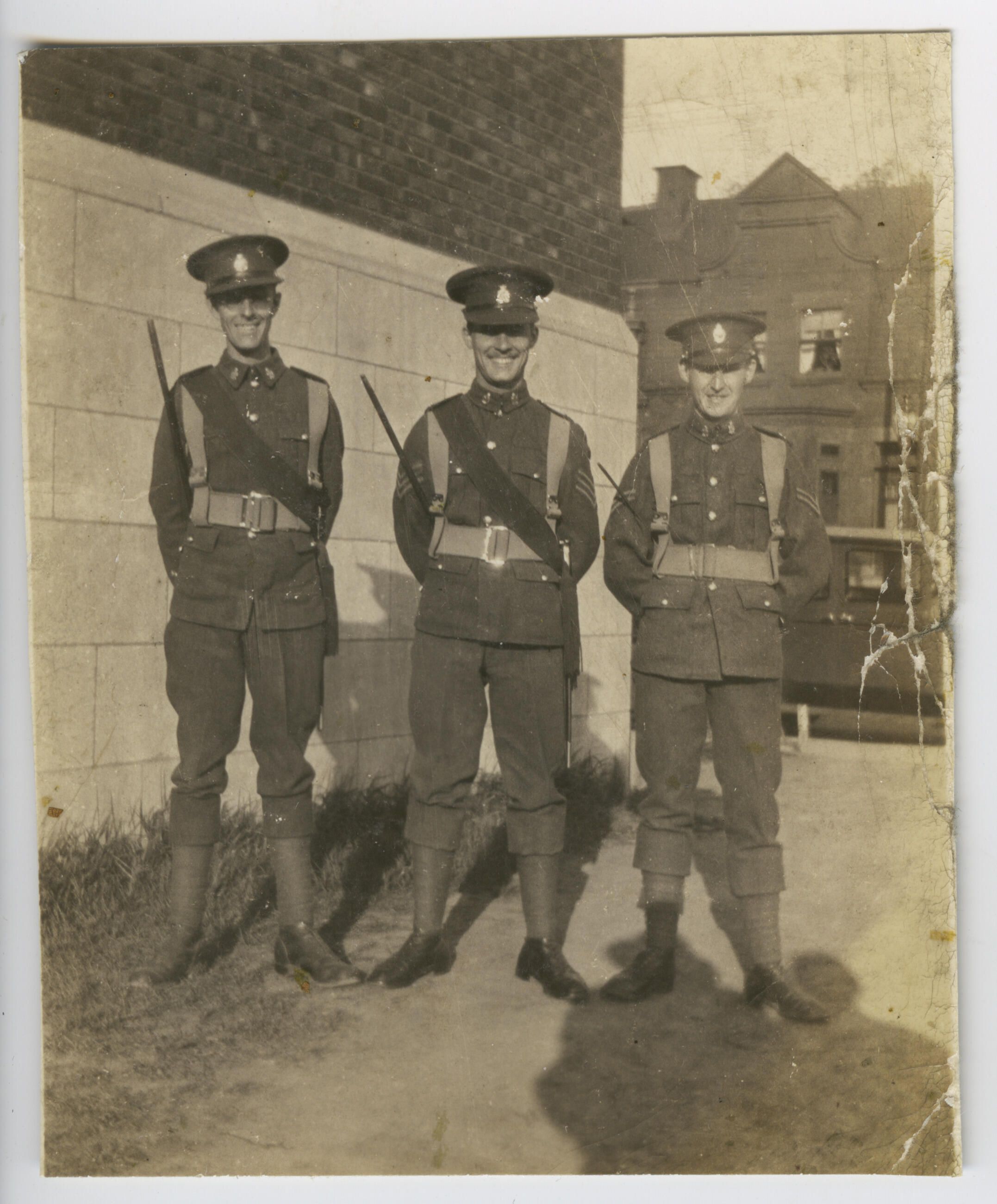 Three NCOs posing for the camera beside the Armoury on St. Catherine St., Montreal.Photograph Details