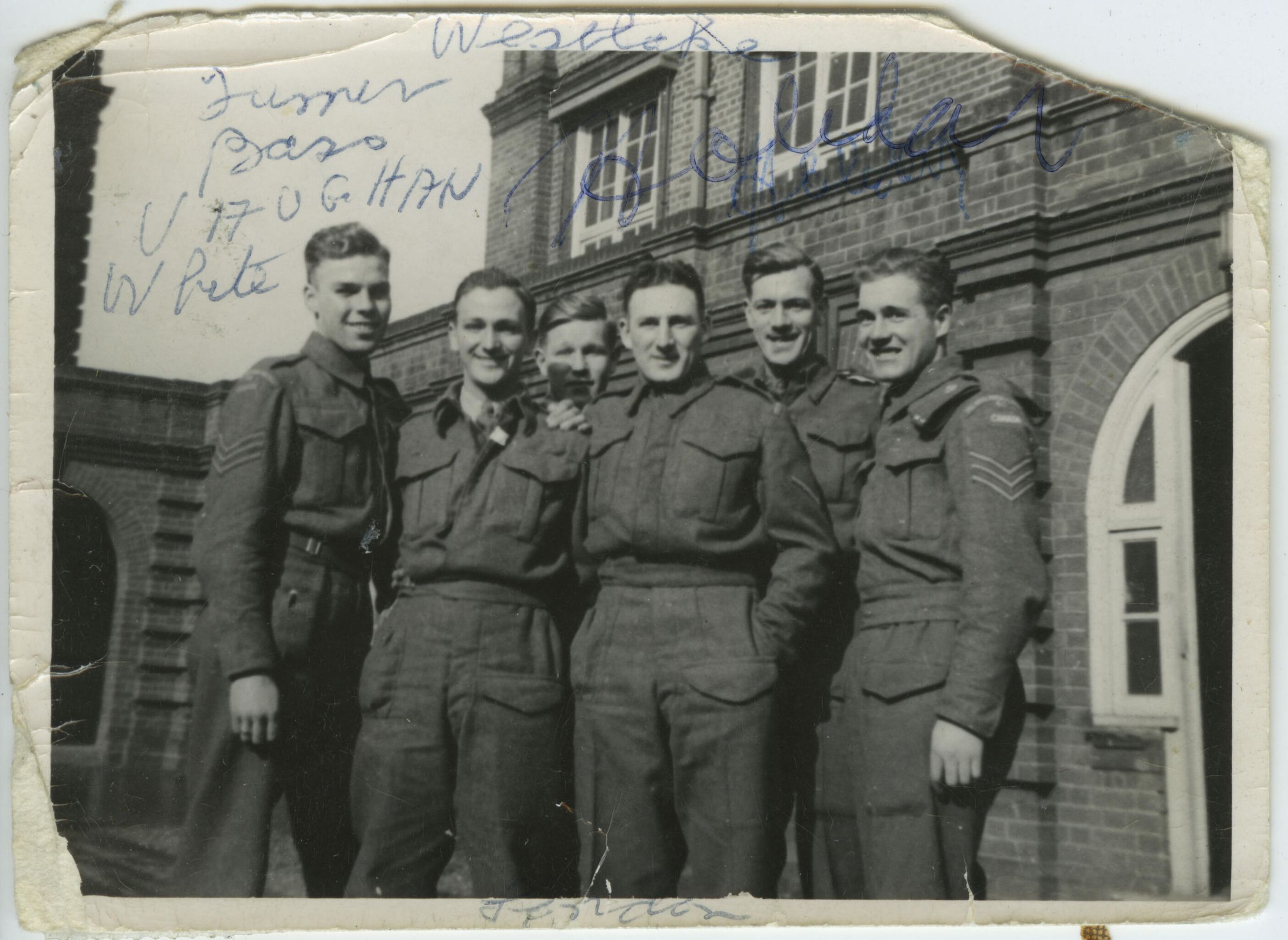 An informal group of six soldiers of the RMR standing outside a brick building.