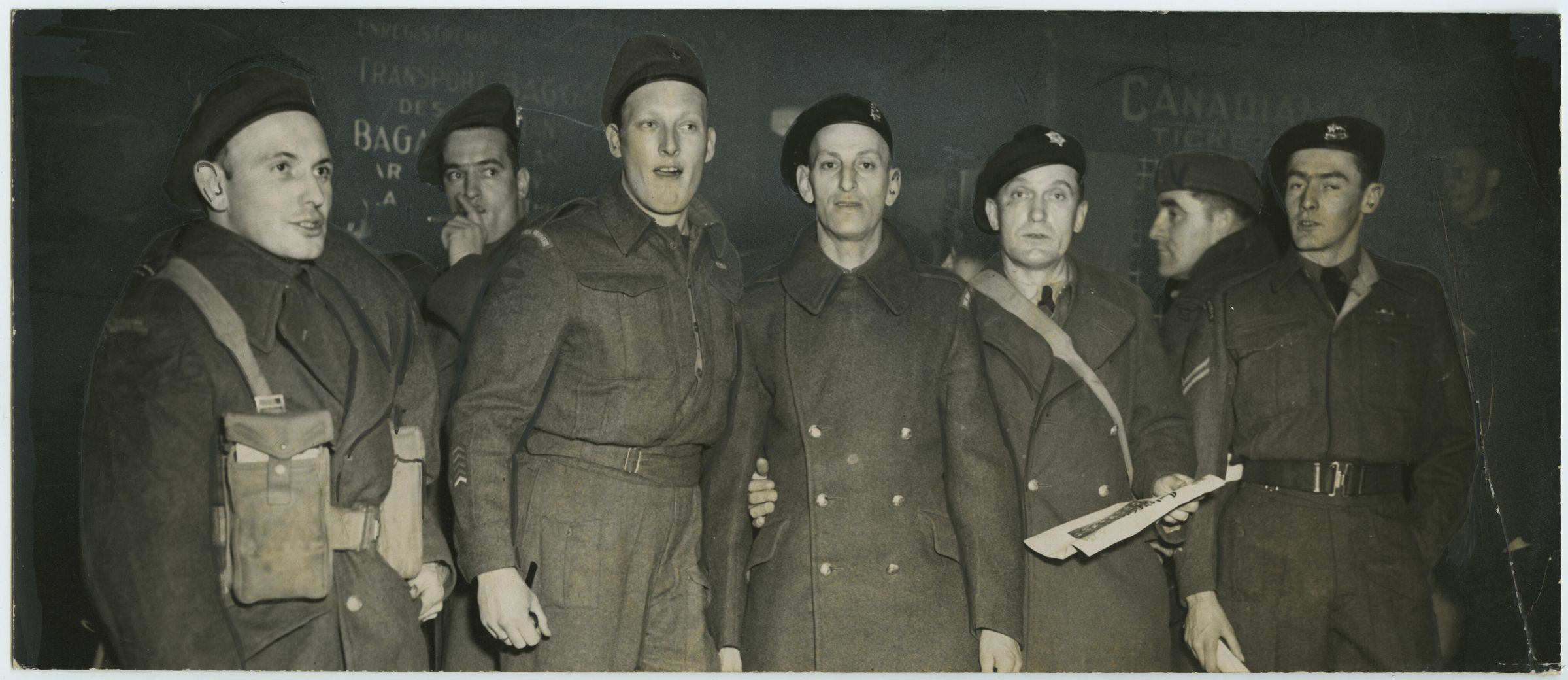 Seven soldiers in battledress are standing in front of a CN Train. The men are wearing cap badges from a variety of regiments and it appears they are all on their way home.