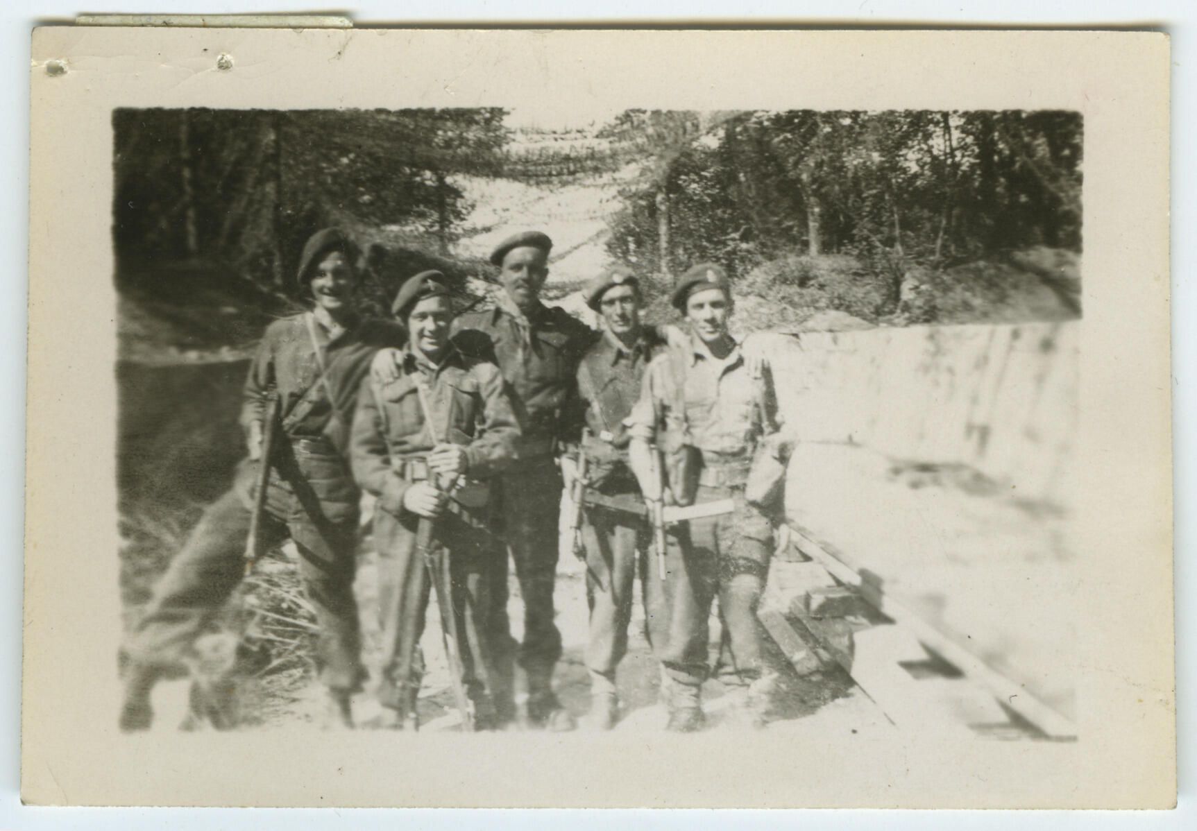 An informal black and white photo of a five man section from the RMR at a "Buzz Bomb" launching site. They are in battledress and carrying either Lee Enfield rifles or Sten Sub-Machine guns. The verso refers to the group as "The Brigands."