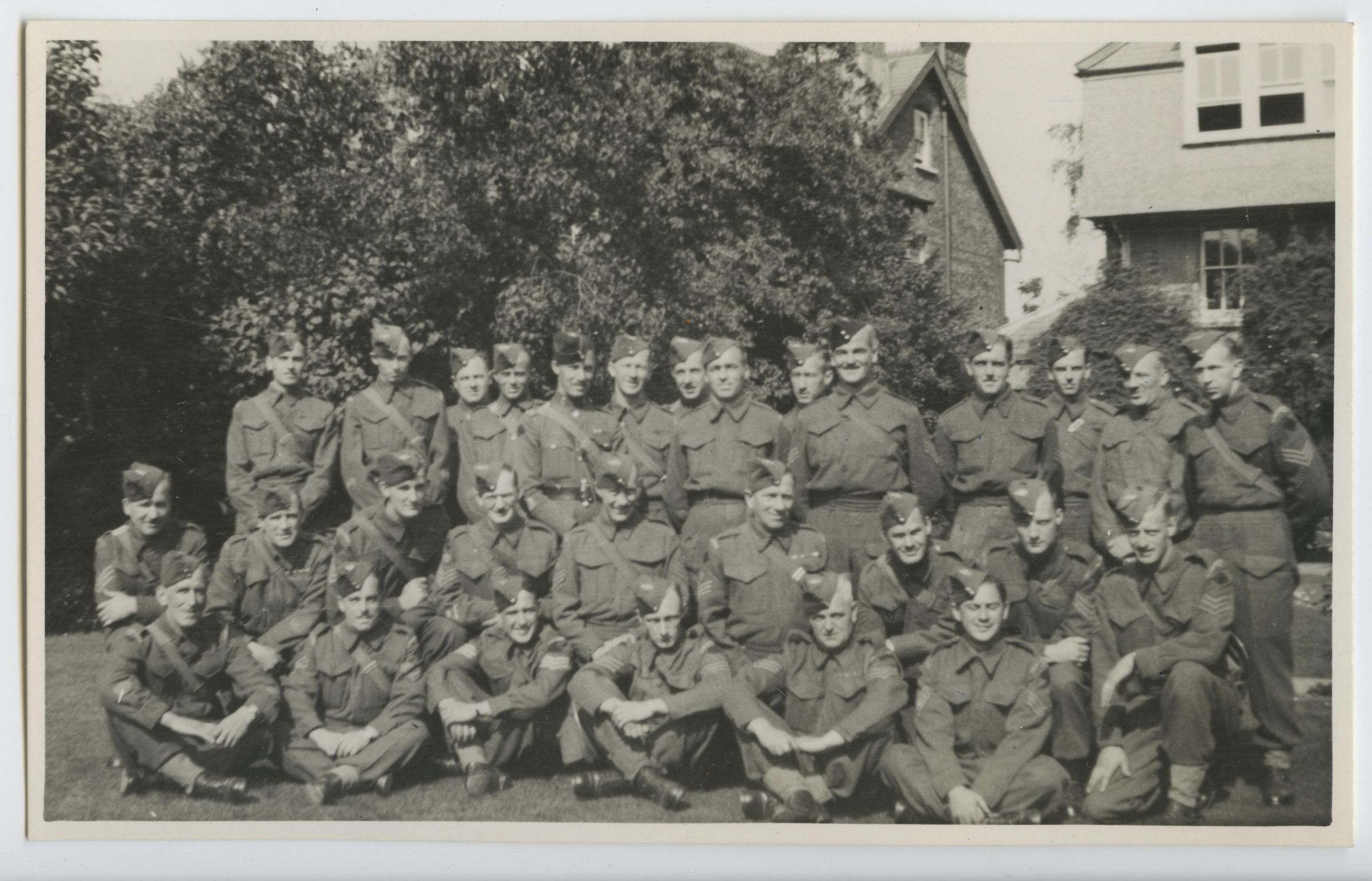A black and white photo of the Warrant Officers and Sergeants of the 1st Battalion. They are all wearing battledress uniforms and wedge caps. RSM James A. Mitchell is standing in the second row wearing a service dress, a Sam Browne Belt and a blue wedge cap.