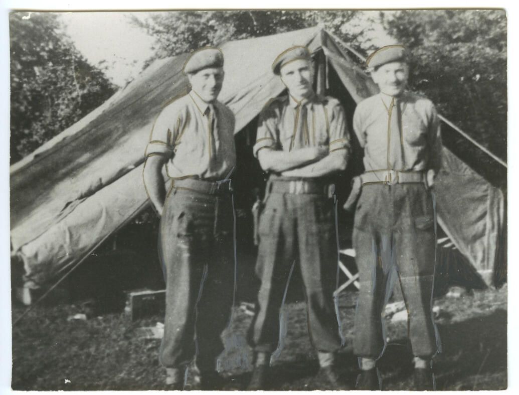 Lieutenants Hal J. Tingle, Bill N. Barclay and Bill Bonnar (Jr) standing in front of a tent. The verso of a copy of this photo refers to "our casualties" indicating that both Tingle and Bonnar were later wounded (on Sept 20, 1944) and that Barclay was killed (on Oct 6, 1944).Photograph Details