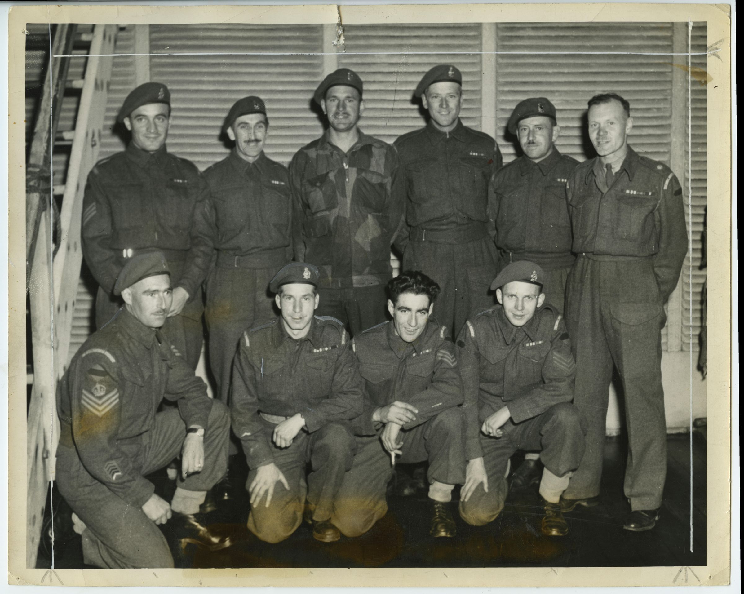 A black and white photo of military personnel coming home from the war, some of them after six years of oversea service. In the rear row, a member of the 1st Canadian Parachute Battalion is wearing the Denison Smock jacket.