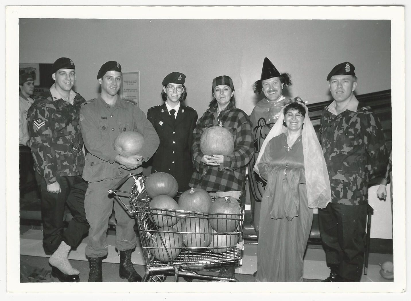 A photograph of members of the Royal Montreal Regiment in uniform with staff members of the Children's Hospital in Halloween costumes. They are bringing a shopping cart full of pumpkins to be delivered to the hospital.