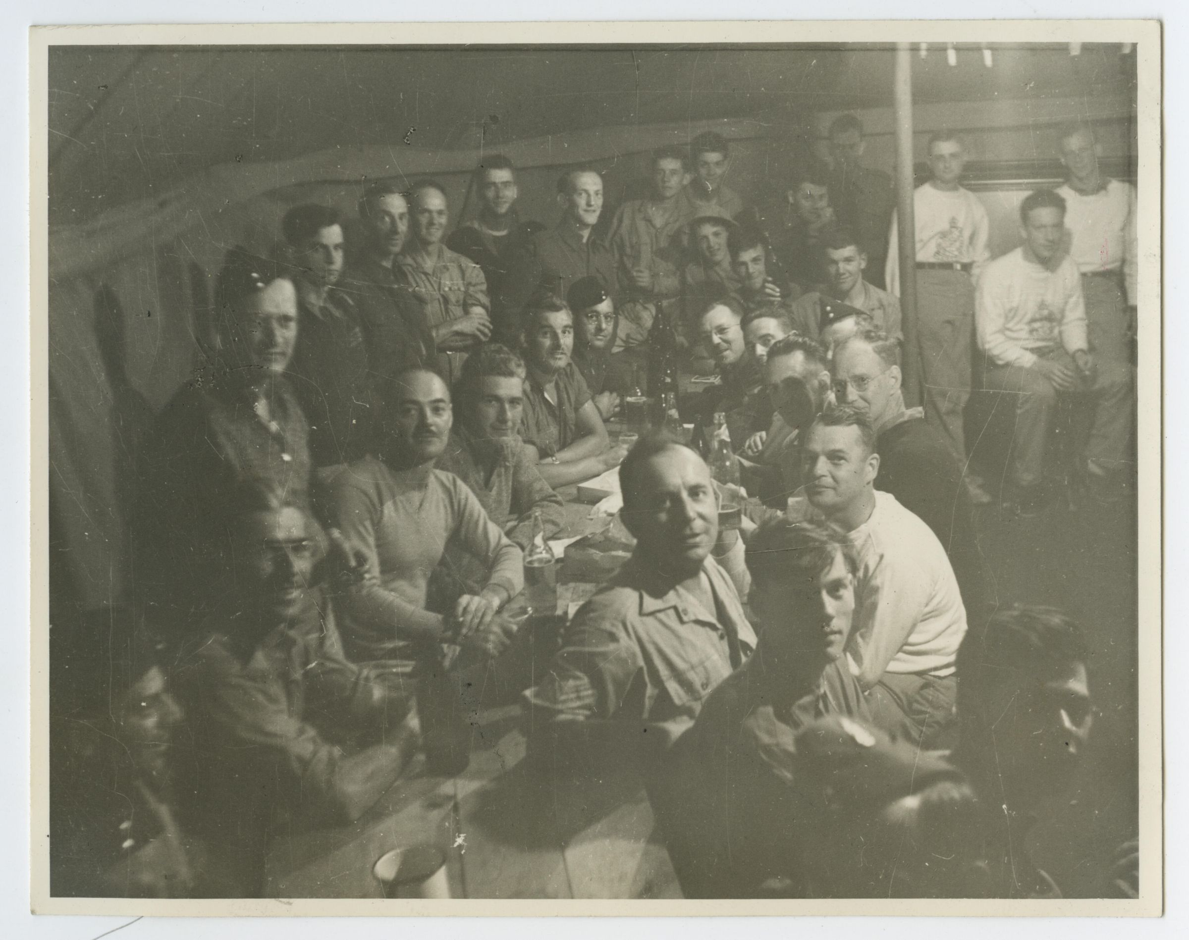 Members of The Royal Montreal Regiment are standing and seated inside a marquee tent that is being used as a mess tent and canteen. The troops are here on their own time, some are out of uniform. Possibly their uniforms have been washed and hung out to dry.Photograph Details