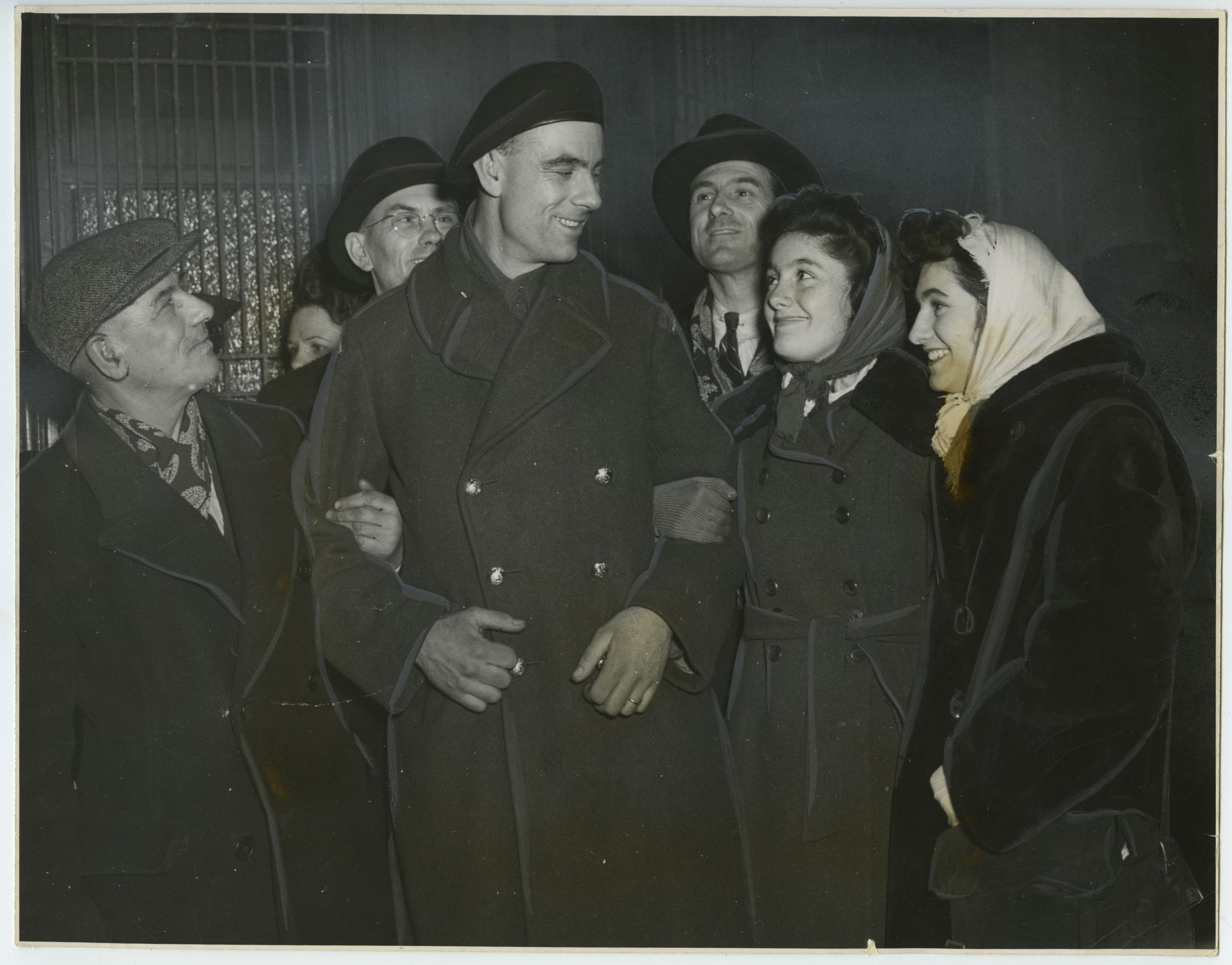 A black and white photo of Trooper W. R. Pollitt, formerly of the 32nd Reconnaissance Regiment (RMR), and the 12th Manitoba Dragoons, home from the front. He is being met by his father, his brothers and his nieces at the Bonaventure train station.Photograph Details