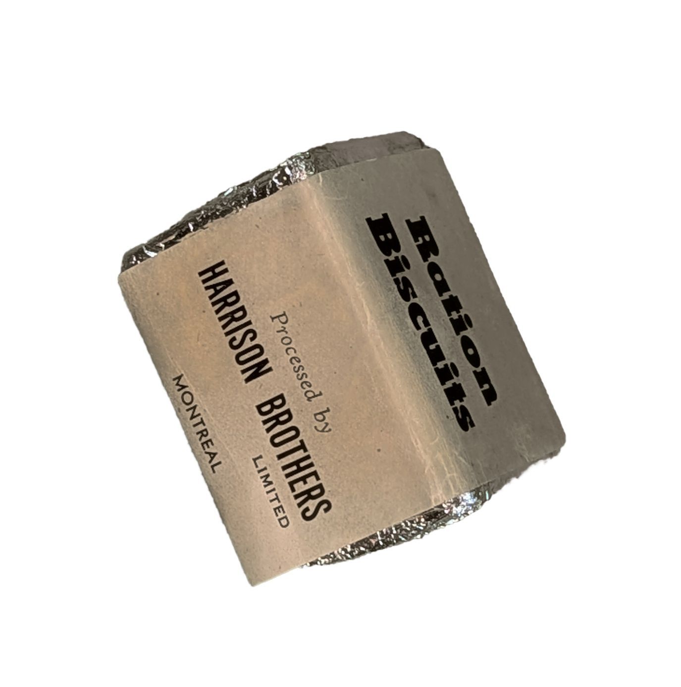 Small packet of ration biscuits made by Harrison Brothers in Montreal. The biscuits are wrapped in tinfoil with the label and name is printed in black on a beige paper wrapping.Use