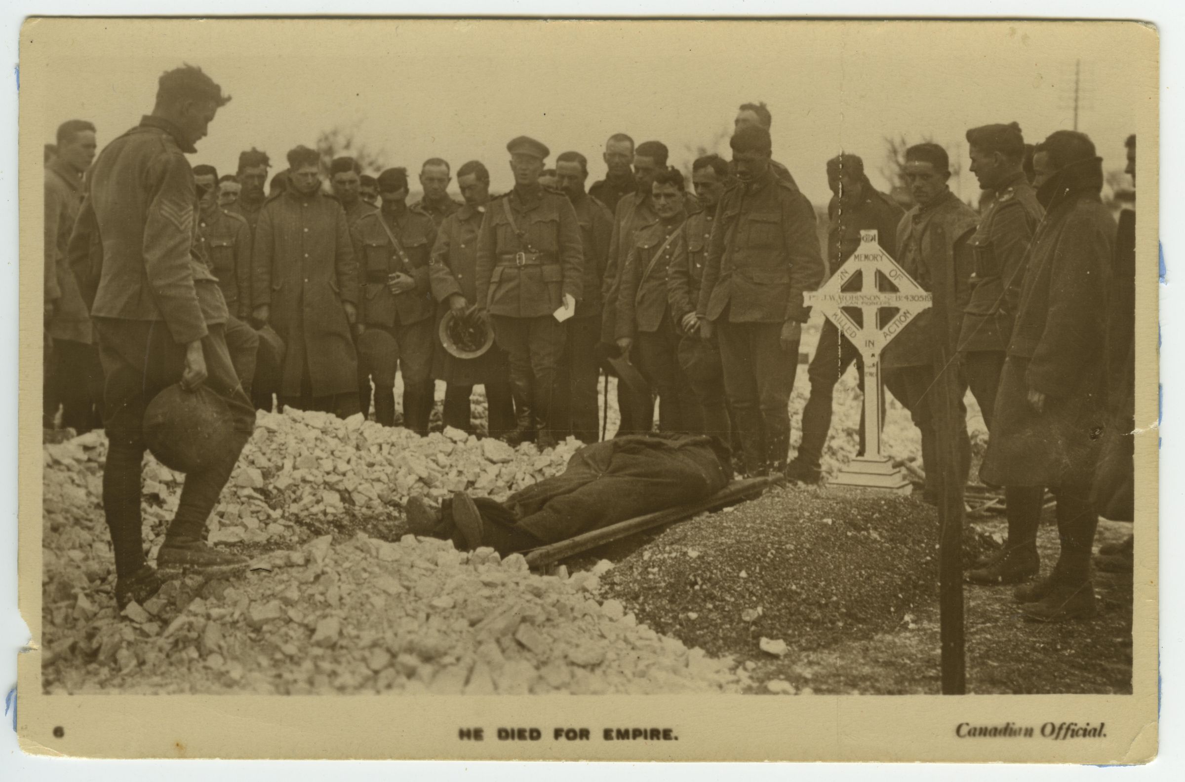 Bare headed soldiers are standing around the grave of a deceased soldier about to be buried. He is resting on a stretcher wrapped in a blanket. A white memorial marker bears his name and details. On the left, at the foot of the grave a soldier standing with his helmet in his hand, while an officer reads the burial service. The grave marker reads: "In the memory of Pte J.W. Robinson 3rd Bn. 430519 Killed in action." Pte Joseph William Robinson was killed in action on Sept. 22, 1916 while serving in the 3rd Cdn. Pioneer Bn.Subject Person/Organization