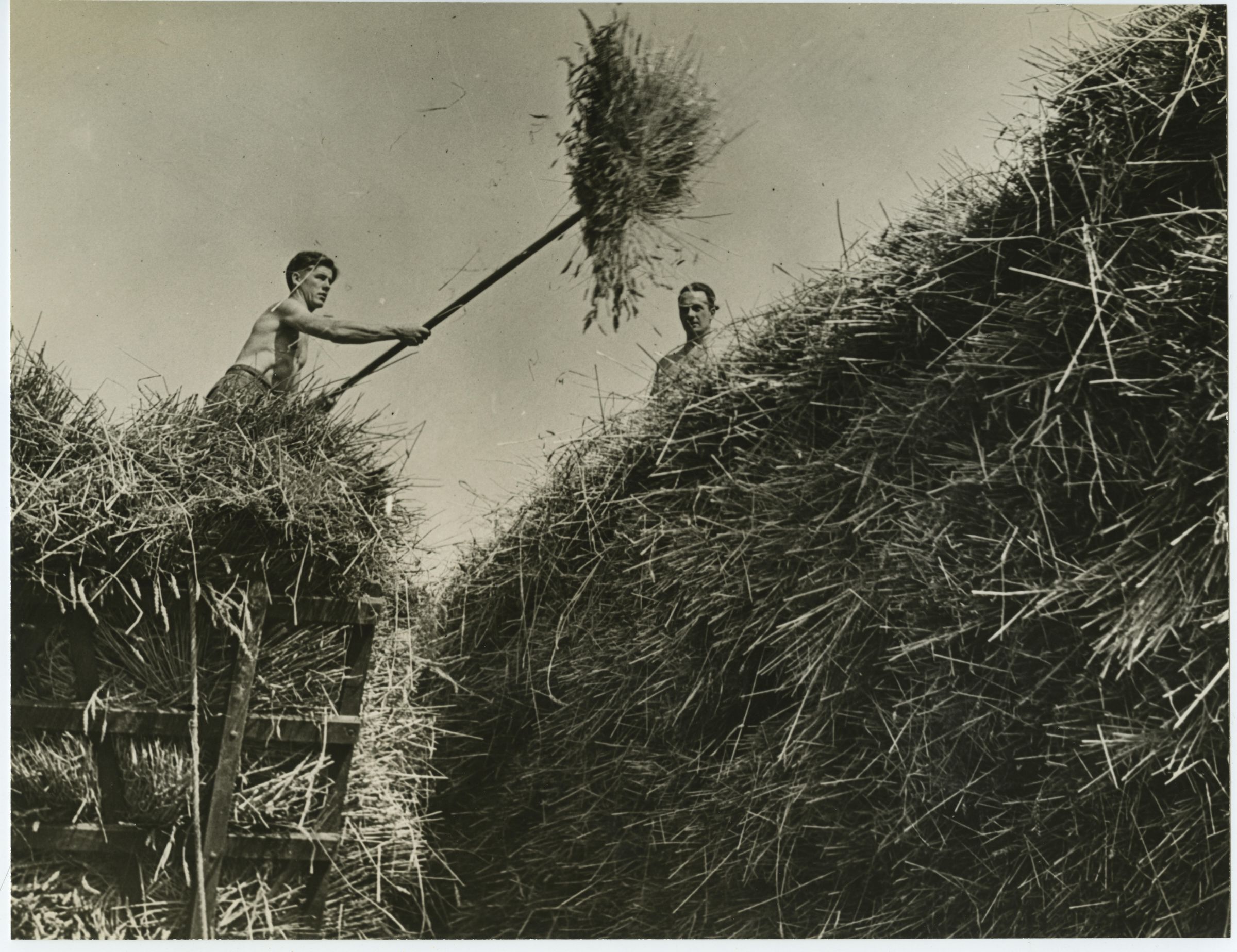 Two RMR members are standing shirtless while pitch-forking hay from a hay-wagon over to a hay mow. They are helping local farmers while they are in England.Photograph Details