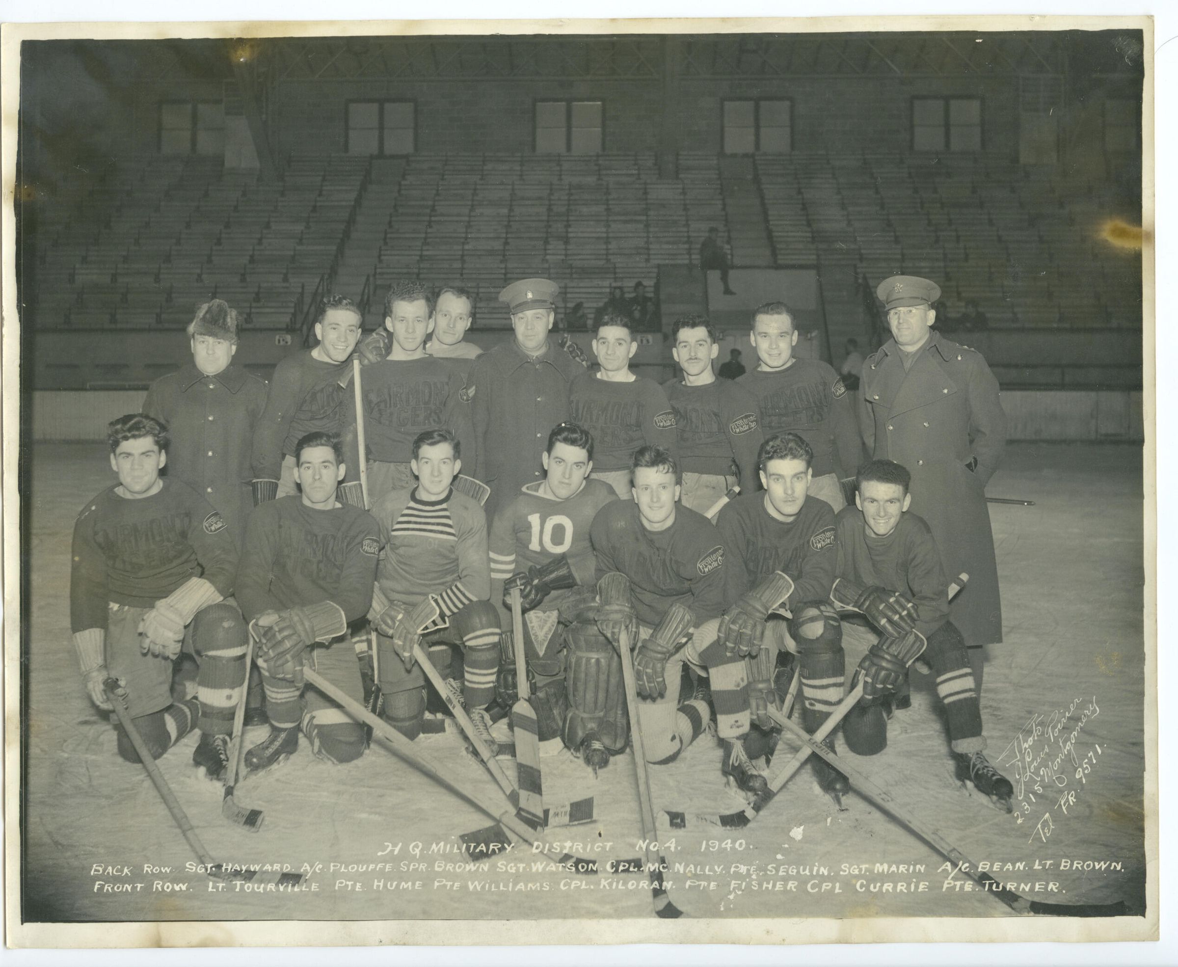A black and white photo of the hockey team raised by the Headquarters, Military District Number 4, for the 1940-1941 season.