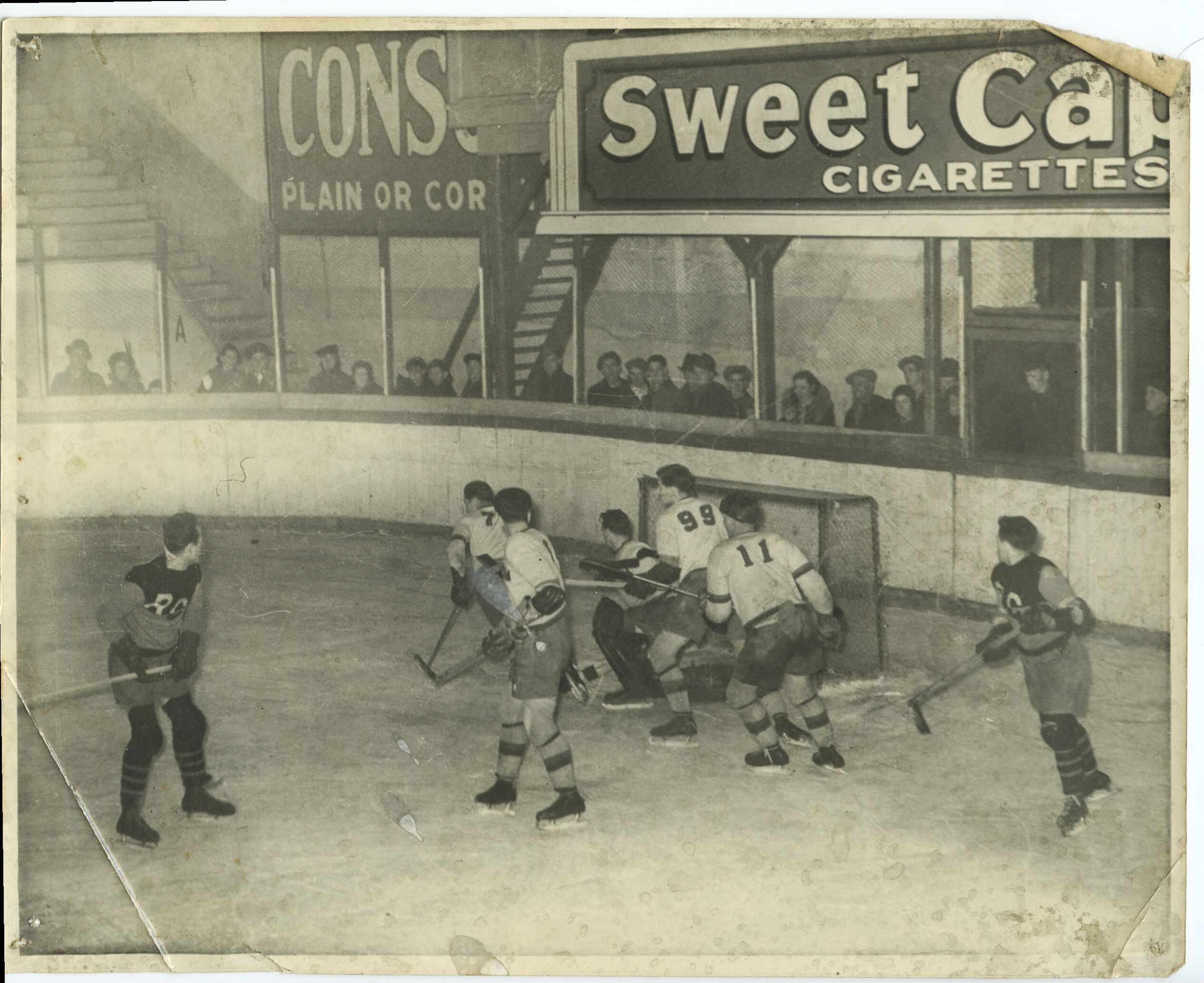 A black and white photo of two hockey teams at play during a game. Fronting the press box above the rinkside spectators are large advertisments for Sweet Caporal cigarettes, and Consols Plain or Cork Tip cigarettes.Made/Created