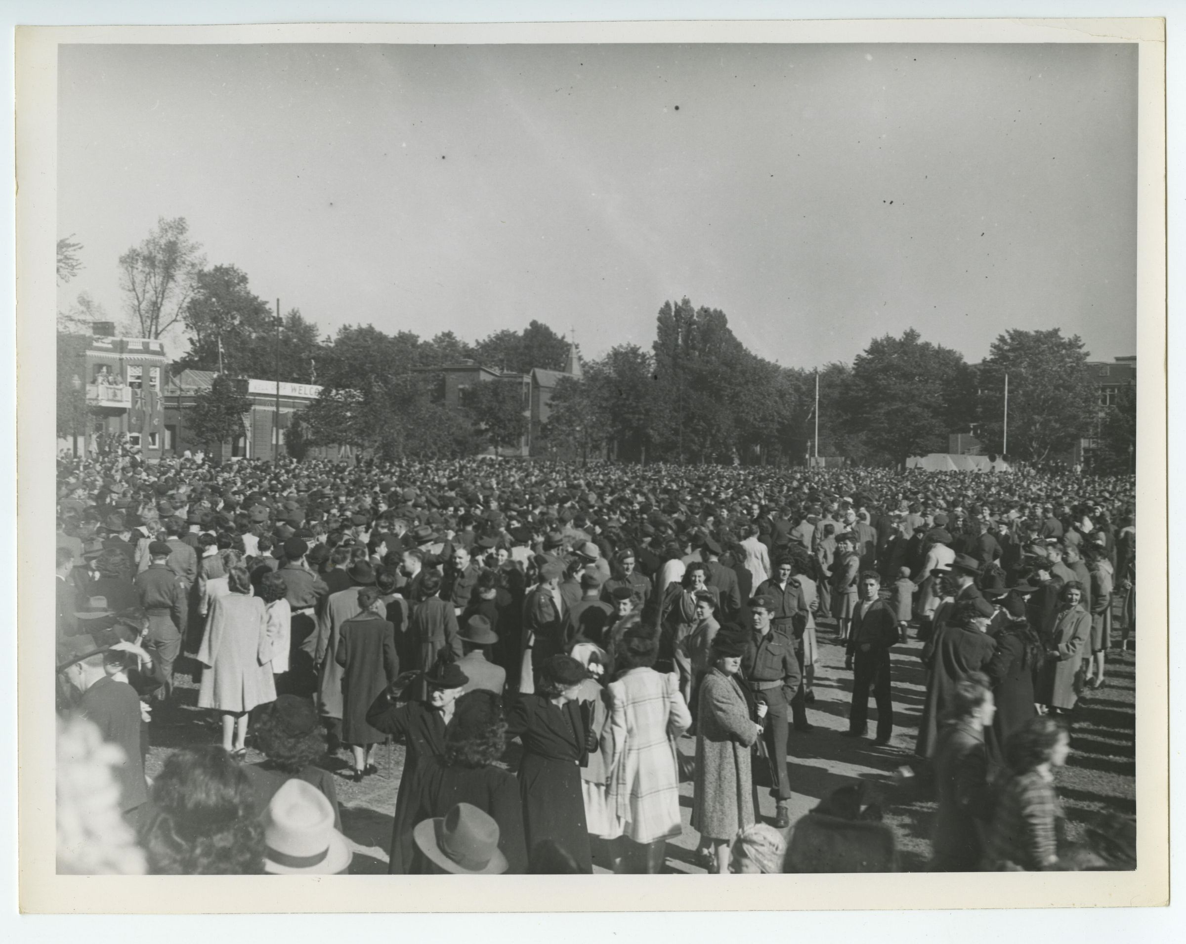 A scene from the 1st Bn. The Royal Montreal Regiment's homecoming held at Westmount Park on Saturday, September 22, 1945. Following the formal dismissal of the the 1st Battalion the parade ground was swarmed by the families of the returned soldiers all eager to see their loved ones home again. This view captures that moment.Photograph Details