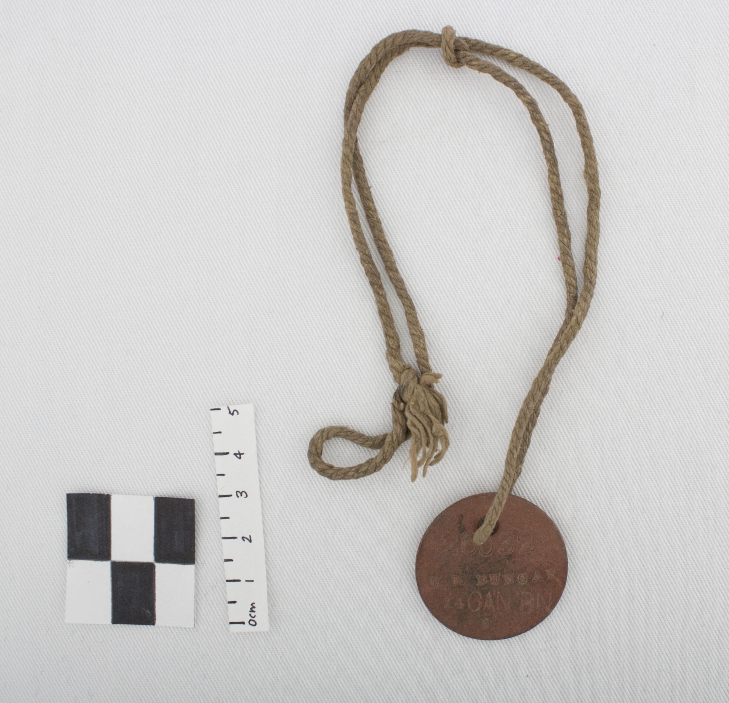 Brown circular disk attached with a string. On it: " 26032 W.R. Duncan 14 Can BN P "Lexicon