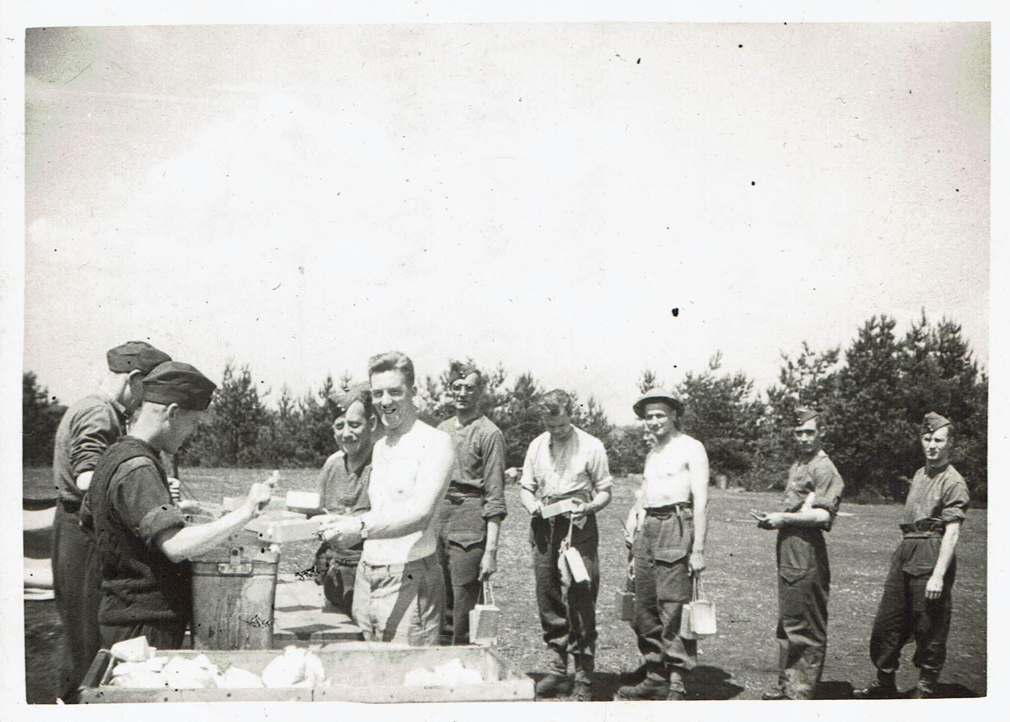 A black and white photo of many soldiers standing in line waiting to be served lunch by the Quartermaster staff. The Scovil brothers, Thomas and Southmayde, are 4th and 5th in line.