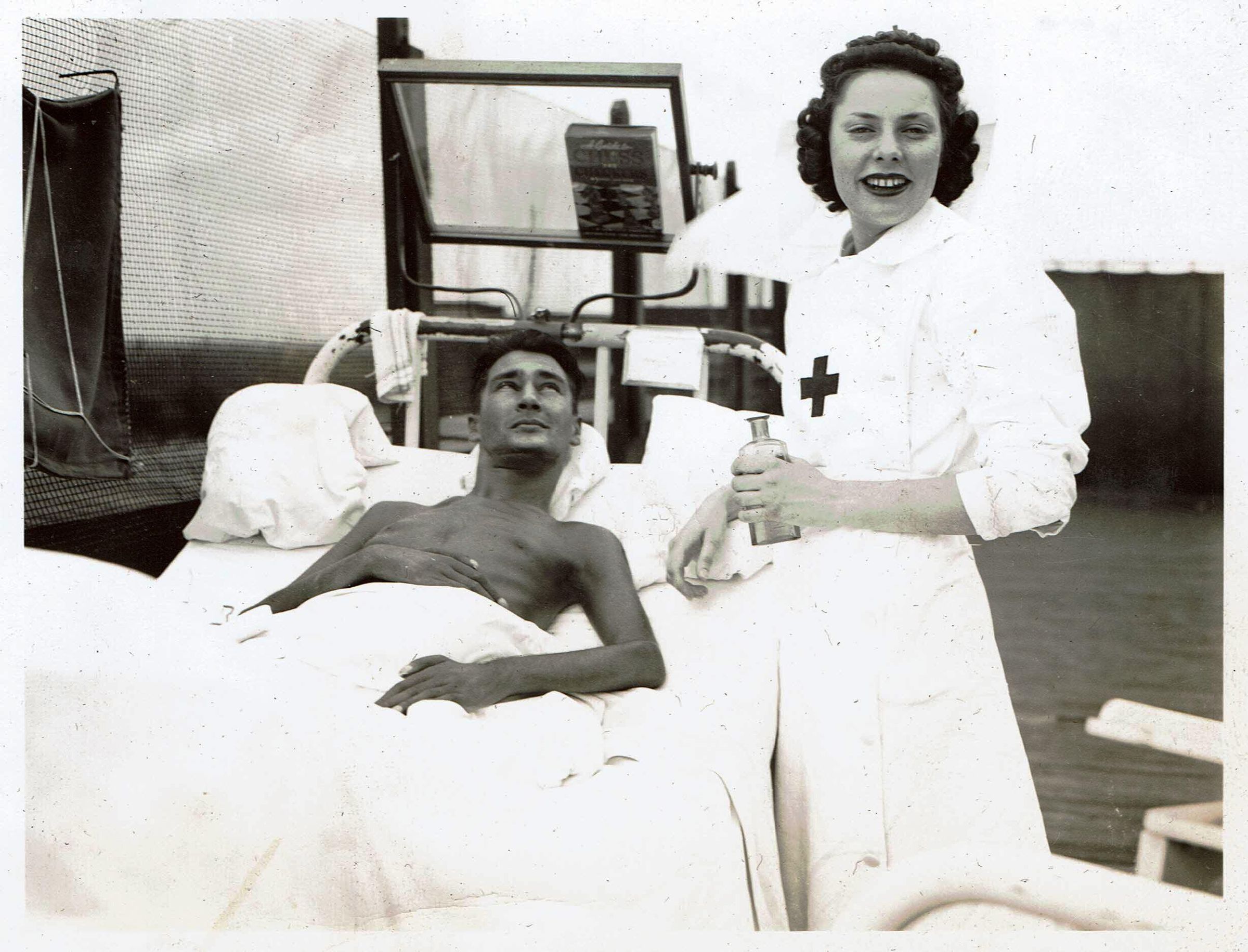 A black and white photo of an injured soldier looking toward a nurse. She is holding a glass bottle probably administrating the patient's medication. This picture was taken during the convalescence of Southmayde S. Scovil at the Christie Street Military Hospital in Toronto.Photograph Details