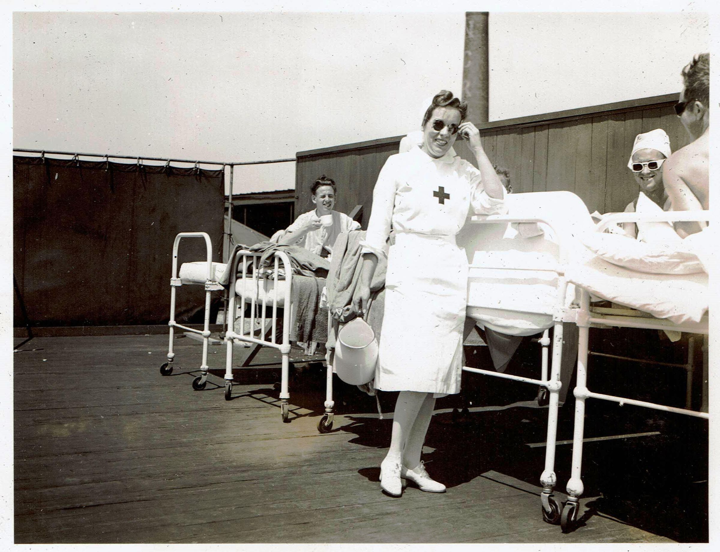 A black and white photo of Jack Campbell and a man identified only as Mackenzie with their nurse Mrs. MacIntosh. They are sunbathing on the rooftop deck of the Christie Street Military Hospital in Toronto. This picture was taken during the convalescence of Southmayde S. Scovil.Photograph Details