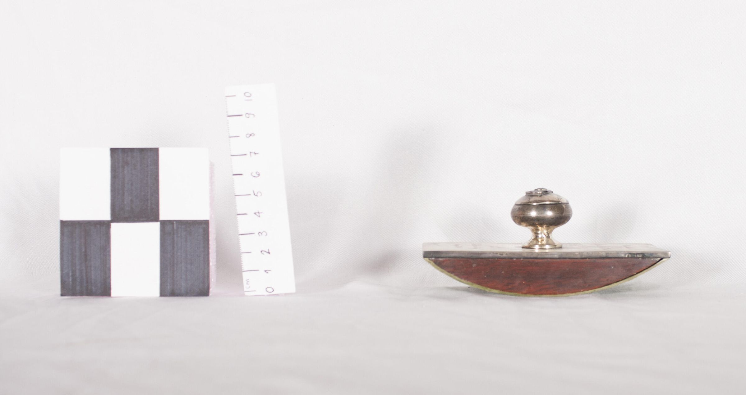 Handheld rocking blotter device to absorb excess ink. It was inscribed: "Presented to Major D. MacRitchie from the Depot Staff Aug. 31, 40." It was presented to Major Donald MacRitchie of the RMR. It bears a blue enameled RMR crest on the handle.Made/Created