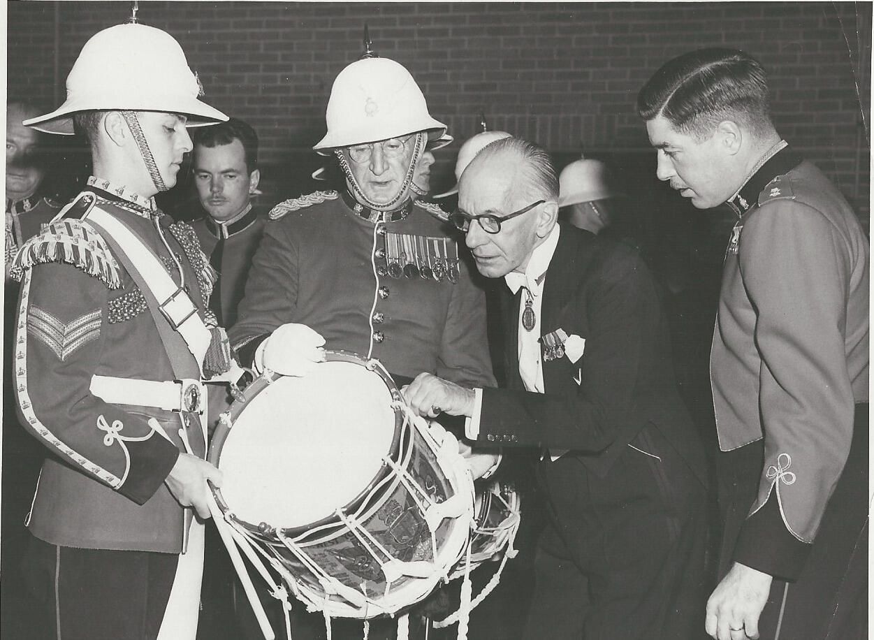 Captain Thomas E. Jackson, Director of Music of The Royal Montreal Regiment, Lieutenant Colonel C. James Pratt and Governor General C. Vincent Massey are examining the West Yorkshire Regiment drum presented to the Warrant Officers & Sergeants of the RMR by their allied RegimentPhotograph Details