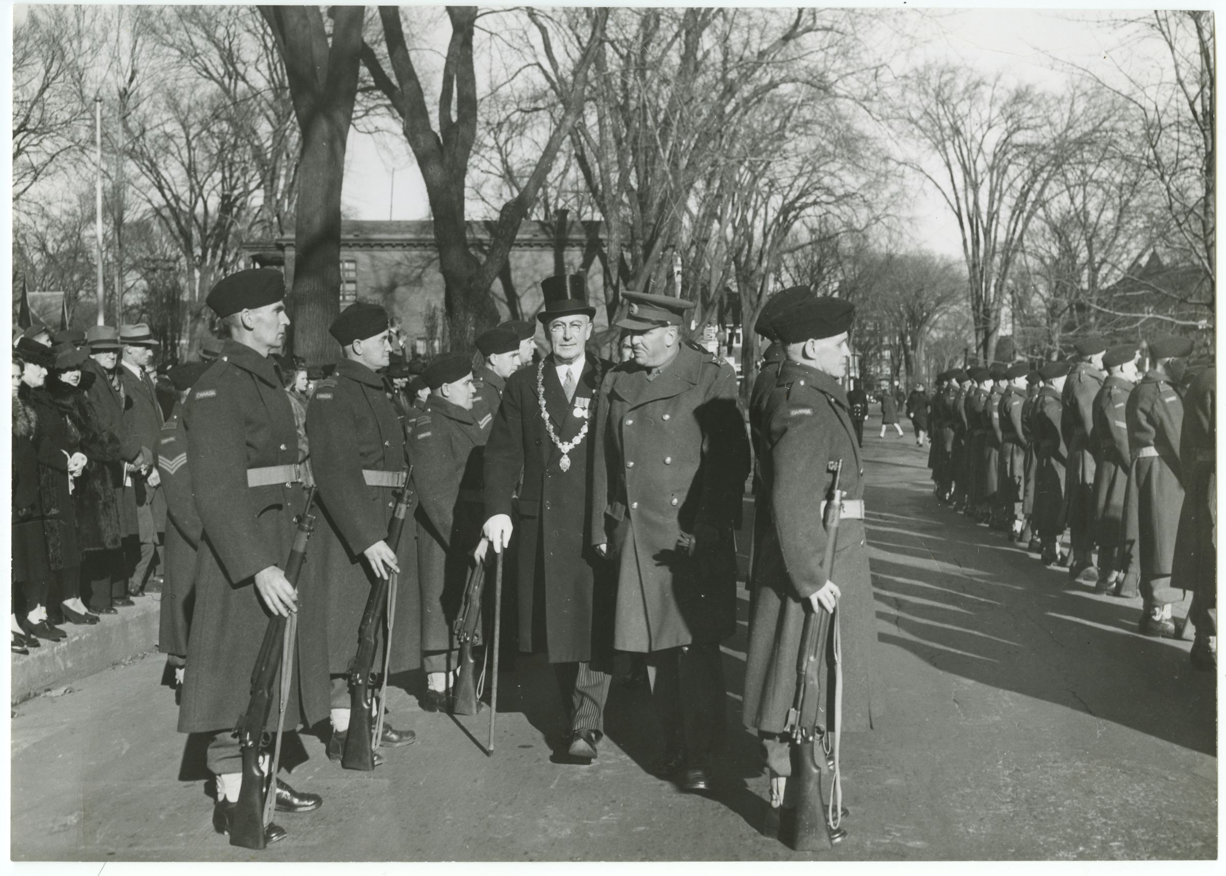 A black and white photo of the 2nd Battalion RMR being inspected by Mayor Walter A. Merrill of Westmount and Major General C. B. Price. They are standing on Côte St Antoine Road in front of the City of Westmount Cenotaph.Photograph Details