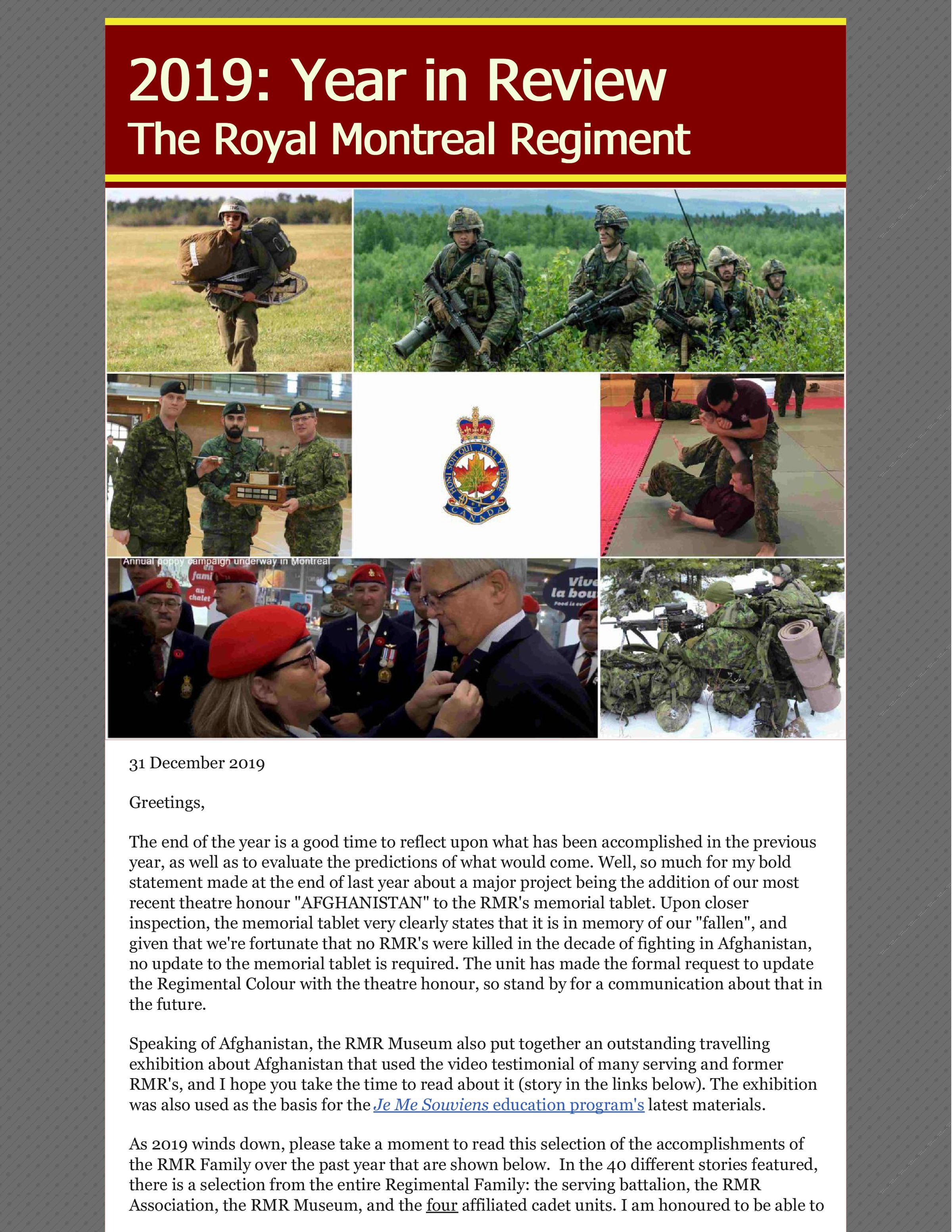 Donovan, Gary, Furholter, Grant, Jasmin, Robinson, Faughnan, Daniel J., Loeven, Alexander, Ste. Anne's Veterans Hospital, Hamel, Charles S., Leprohon, Edouard Travers, Parnell, Alfred Douglas Comer, Brewer, Hugh Graham, Vincent, Alan P., Robinson, Colin Angus, 1 West Montreal Squadron, Alexander, Triston, Dobrosielski, J., Townsend, Kenton, Perchun, Sergey, Doucet, René, Morneau, Gabriel, Oleshko, Alexey, Leroux, Stephan, Doughty, Kevin, Whitehead, George Victor, Jonasz, Maciej, Slessor, J. Hamilton, Ene, Laurent, Gohier, Georges E. R., McLaughlin, Anthony, Dimayuga, Paolo, McNair, Brent, 34th Signals Regiment, Gareau, Nathalie, Presseau, Melanie, Kastoun, Paul, Carroll, Liam, Anctil, Andrew, McKenna, Joseph Ernest, Baburin, Roman, Faiz, Mohammed, Quesnel, Jim, 588 Eric Simms Squadron. Royal Canadian Air Cadets, Price, Charles Basil, Dodds, William Okell Holden, Michaud, Vanessa, Hart, David, Pulliam-Therrien, Justin, Stephen, Lord Mount, Sullivan, Christopher Healey, Trent, Peter Francis, Randall-Coss, C. B., Garneau, Joseph Jean-Pierre Marc, Garber, Richard, The Royal Montreal Regiment Association, Branch 14, Royal Canadian Legion, Giraldo, John, McCombe, Gault, Enriquez, Medwin, Canadian War Museum, Ezedin, Rayan, Fucile, Federico, Bensadoun, David, Ruiz-Laing, Dexter, Fisher, Frank William, Worrall, Dick, Shone, John Lindegaard, Lefevre, Colgan, Brian, Murphy, Albert Hanley, Karkatsoulis, Nicholas, Yeung, Hunter, Creegan, Alfred Henry, Tuxford, George Stuart, RMR Museum, Windsor, Arthur, Duke of Connaught and Strathearn, Siket, George