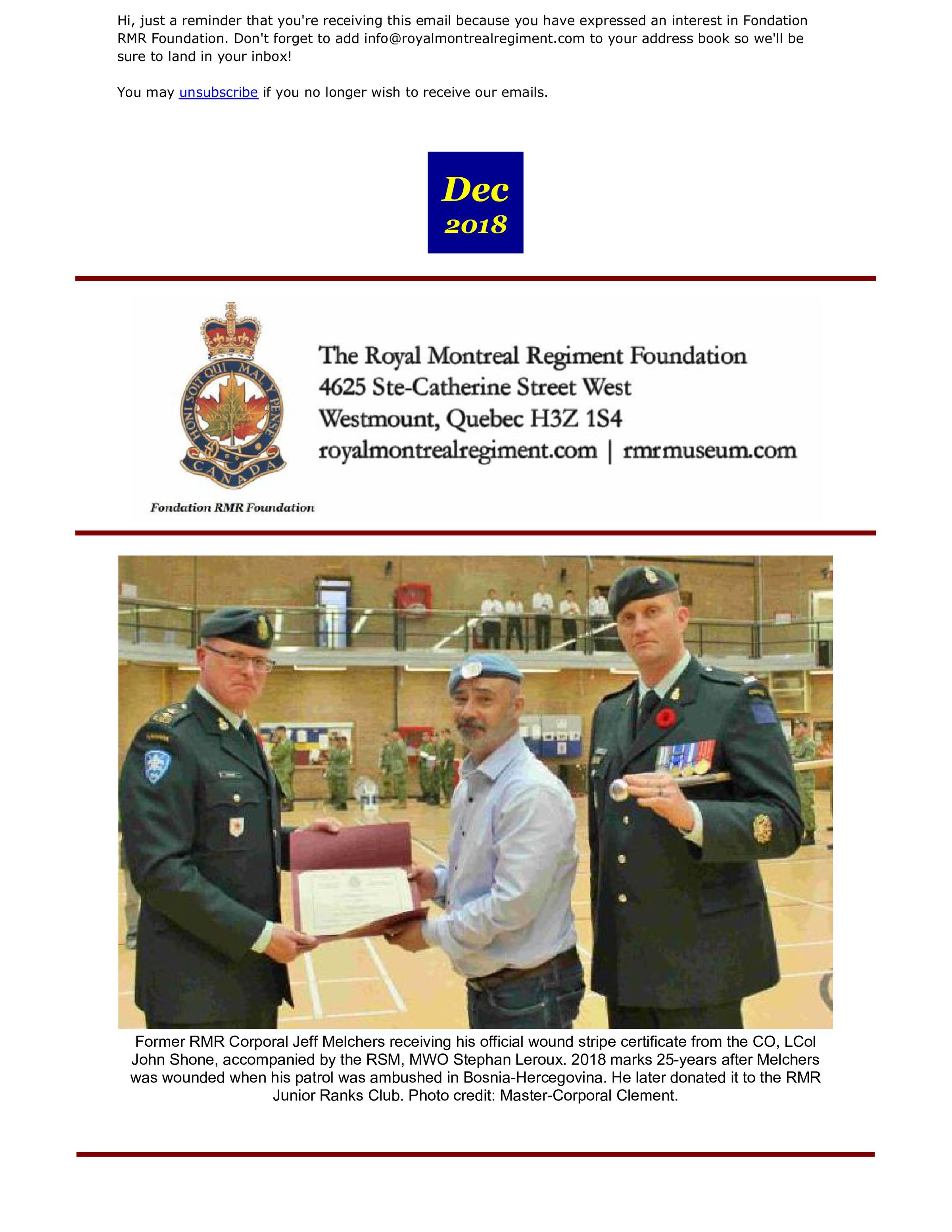 Smith, Christina, Loeven, Alexander, Melchers, Jeff, Robinson, Colin Angus, Catudal, Bryan, RMR Foundation, Leroux, Stephan, Ene, Laurent, Smyth, Marina, Gohier, Georges E. R., Rahmani, Jam, Presseau, Melanie, Hollingdrake, Cedric, Belvedere, John, Guerin, Suzanne C., Pellow, Tess, Randall-Coss, C. B., The Royal Montreal Regiment Association, Branch 14, Royal Canadian Legion, Canadian War Museum, O'Driscoll, Brigitte, Canada Company, Je Me Souviens, Shone, John Lindegaard, Officers' Mess, RMR Museum, Steinberg, William, Molson, Andrew, Ezedin, Rayan