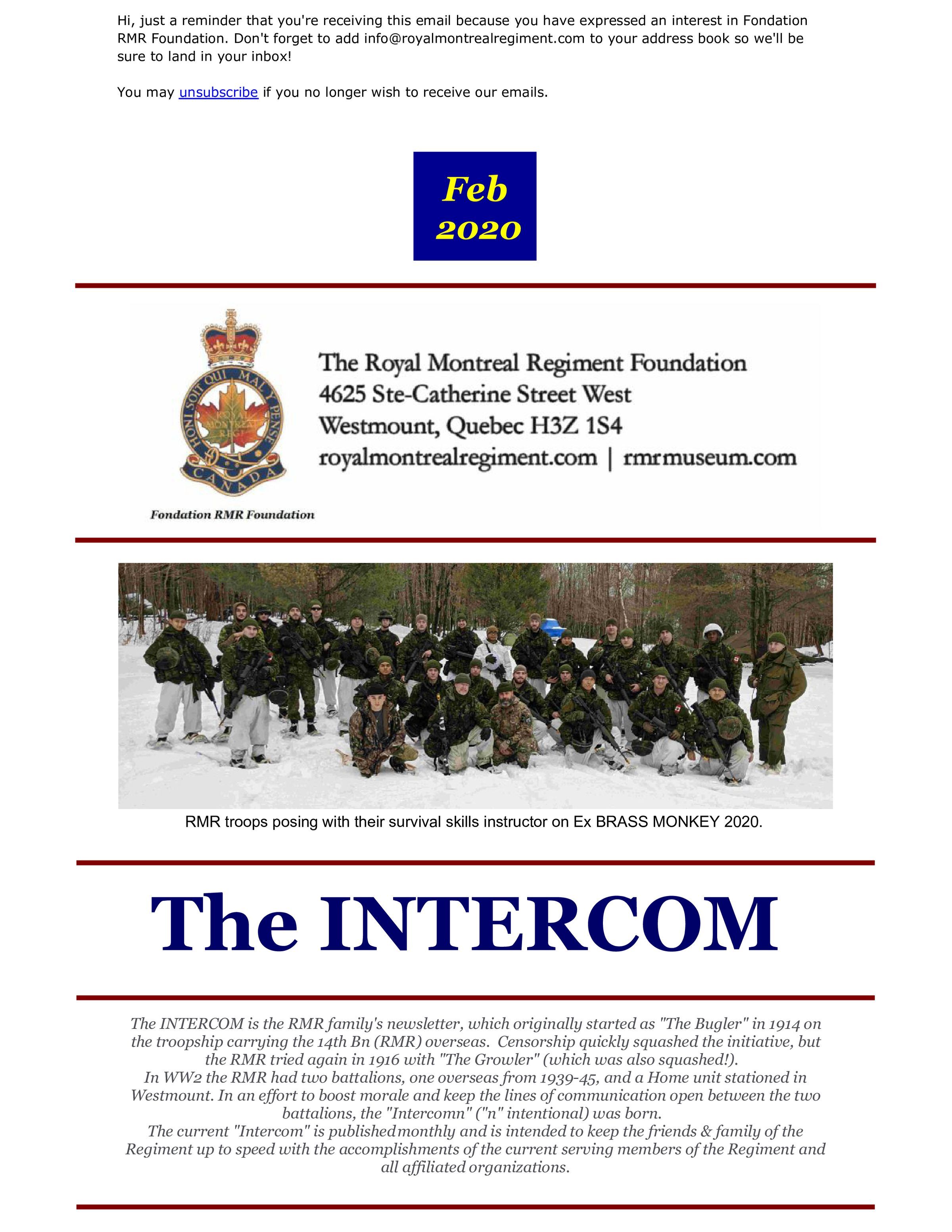 The issue opens with the Honorary Colonel's review of Regimental events during the previous month. Articles include: promotion of the RSM; announcement of a concert to raise funds for Guitars for Vets; a brief article recognising the recipiant of the Museum's Visitor of the Year Award; an illustrated article about Ex Brass Monkey 2020; and the Honorary Colonel's Christmas Dinner 2019.