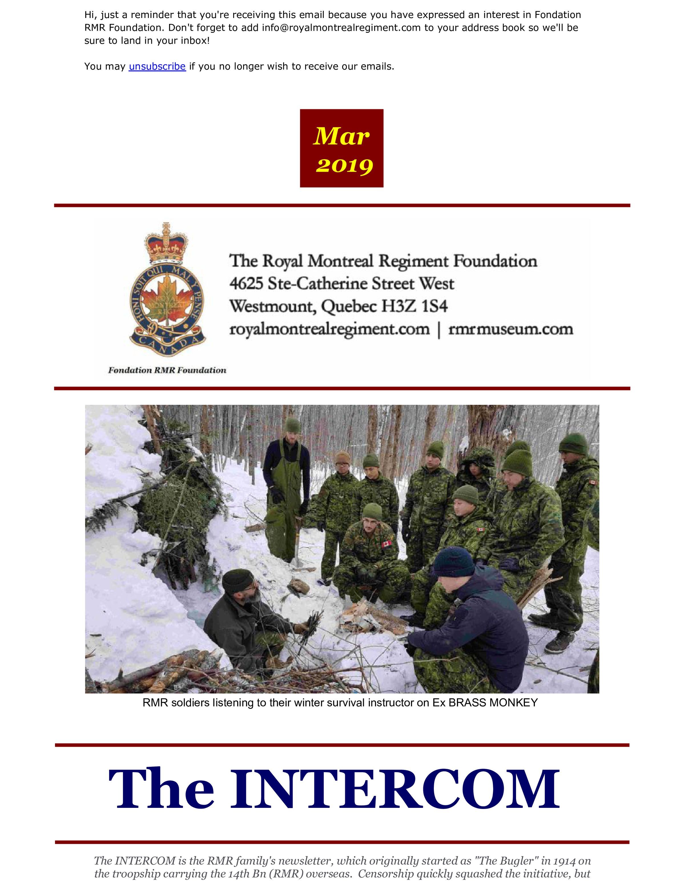 The Honorary Lieutenant Colonel writes about current and pending events including: