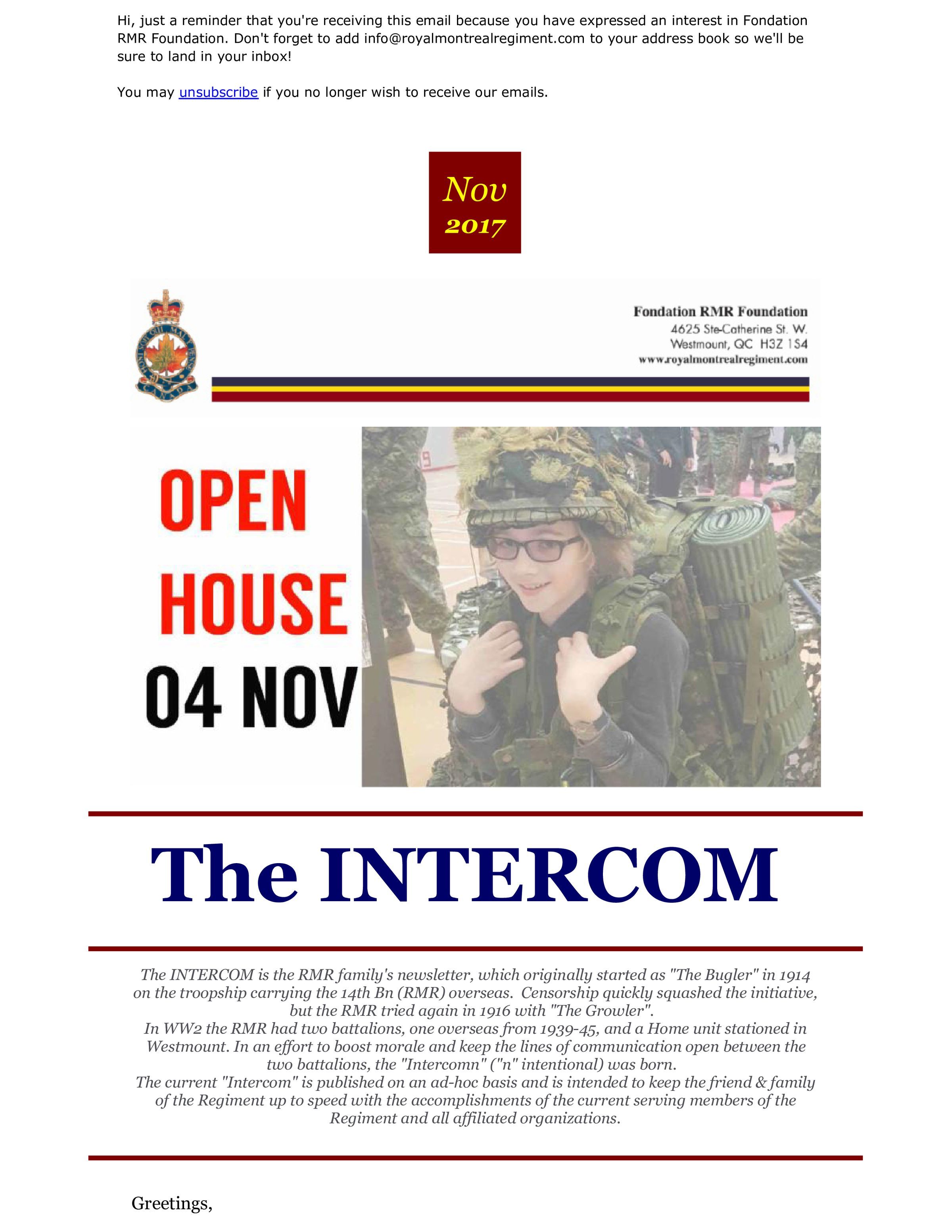 Robinson, Colin Angus, Molson, Andrew, Shone, John Lindegaard, Duval, Raymond, RMR Museum, The Royal Montreal Regiment Association, Branch 14, Royal Canadian Legion, Guerin, Suzanne C., Smith, Christina, Gohier, Georges E. R., 2862 Royal Montreal Regiment (Westmount), RCACC, Brooker, Sybil, Perchun, Sergey, RMR Foundation